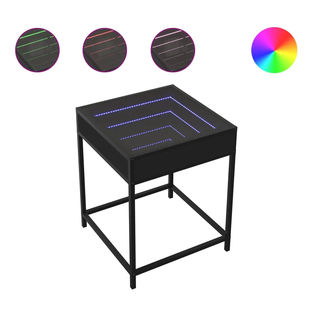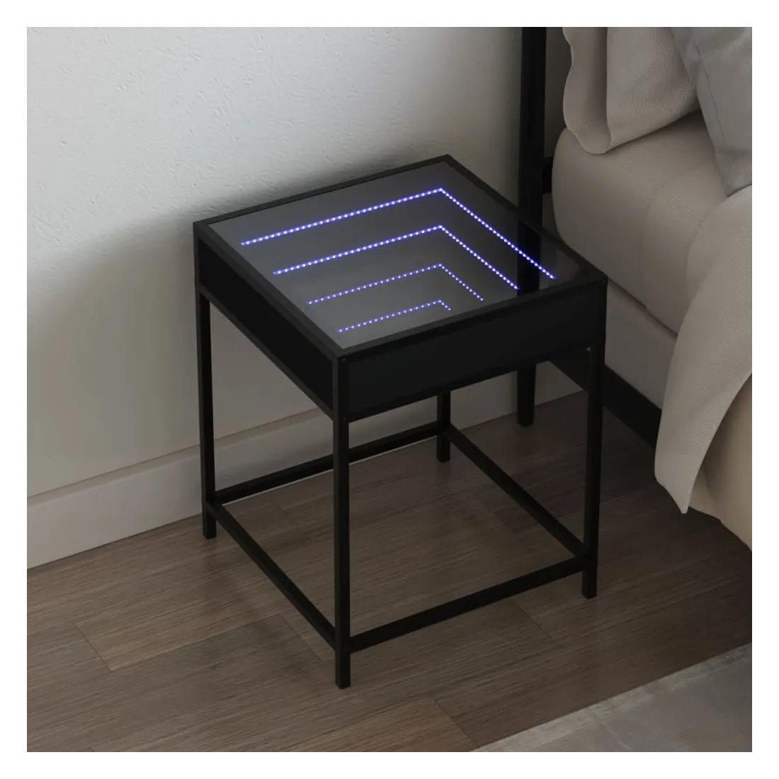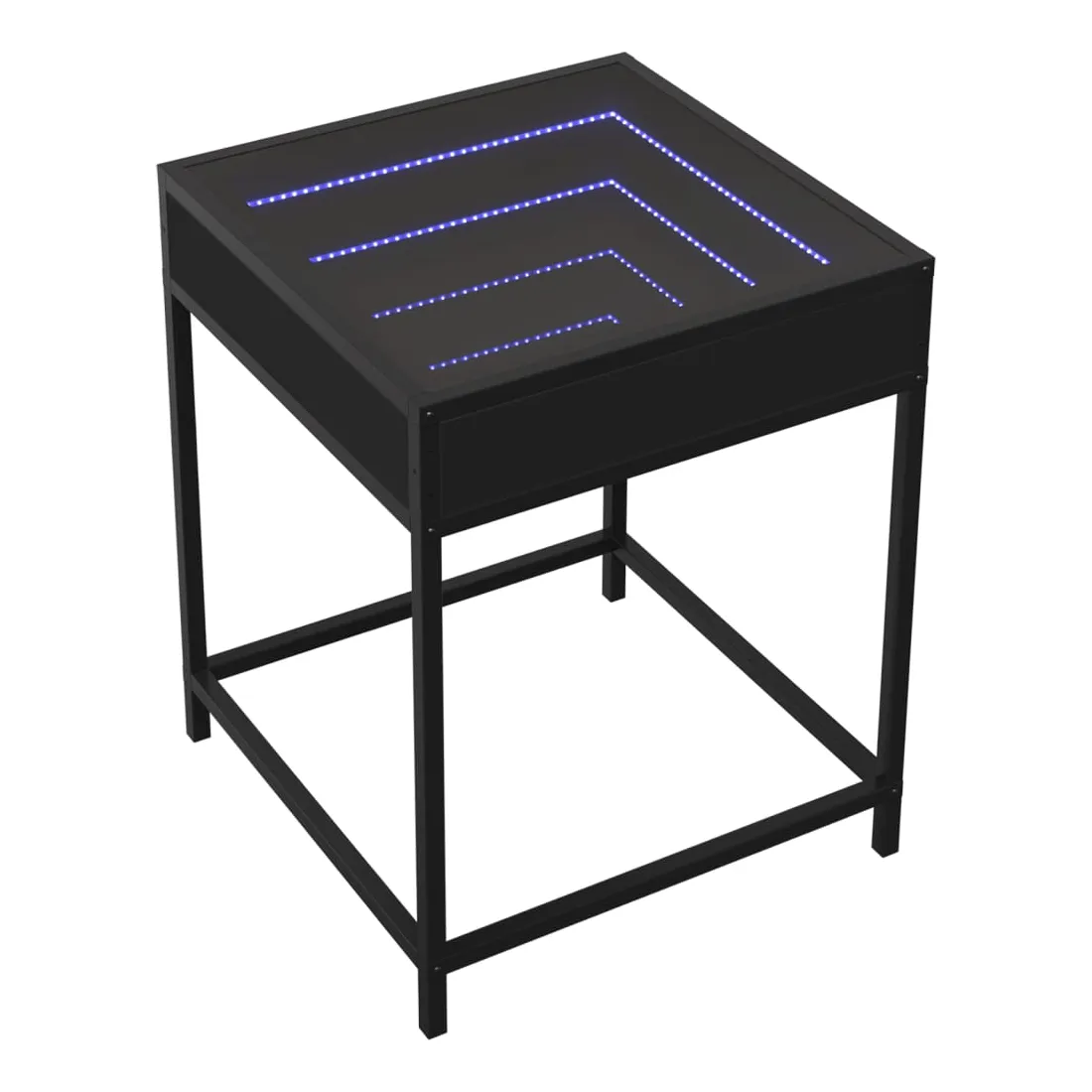 Cette table de chevet avec un miroir à LED infini constitue un ajout intemporel à votre décoration intérieure. Matériau stable et durable : le bois d'ingénierie est un matériau durable et stable dont la surface lisse résiste à l'humidité, à la déformation et au fendillement, ce qui en fait un choix fiable pour une grande variété de projets. Structure robuste : le cadre en métal de la table ajoute un style industriel à votre intérieur tout en garantissant robustesse, stabilité et longévité. Lampes LED RVB pour une ambiance agréable : cette table est dotée de lampes LED qui peuvent être facilement réglées pour créer un spectacle lumineux personnalisé. Vous pouvez personnaliser les modes, les couleurs et la luminosité pour améliorer l'ambiance de votre espace intérieur.Dessus de table stable et robuste : le dessus de table robuste est idéal pour placer vos objets décoratifs ou tout autre objet nécessaire à portée de main. Bon à savoir : Ce produit est doté d'un connecteur USB qui nécessite une source d'alimentation USB de 5V certifiée (non incluse).