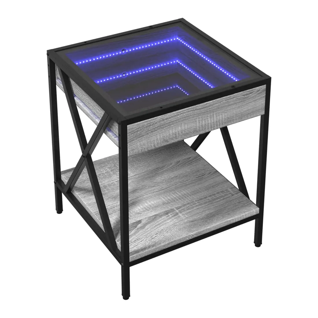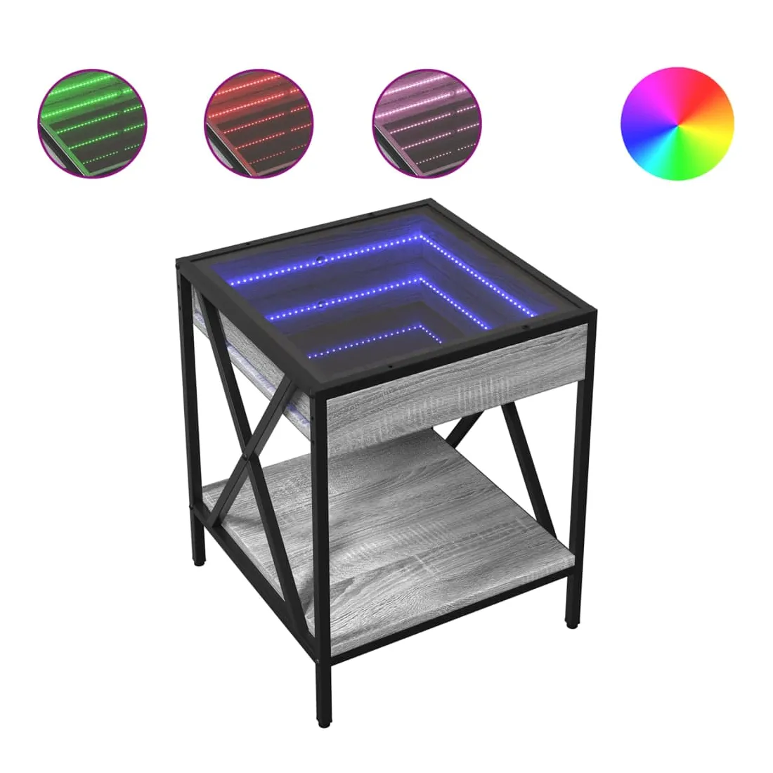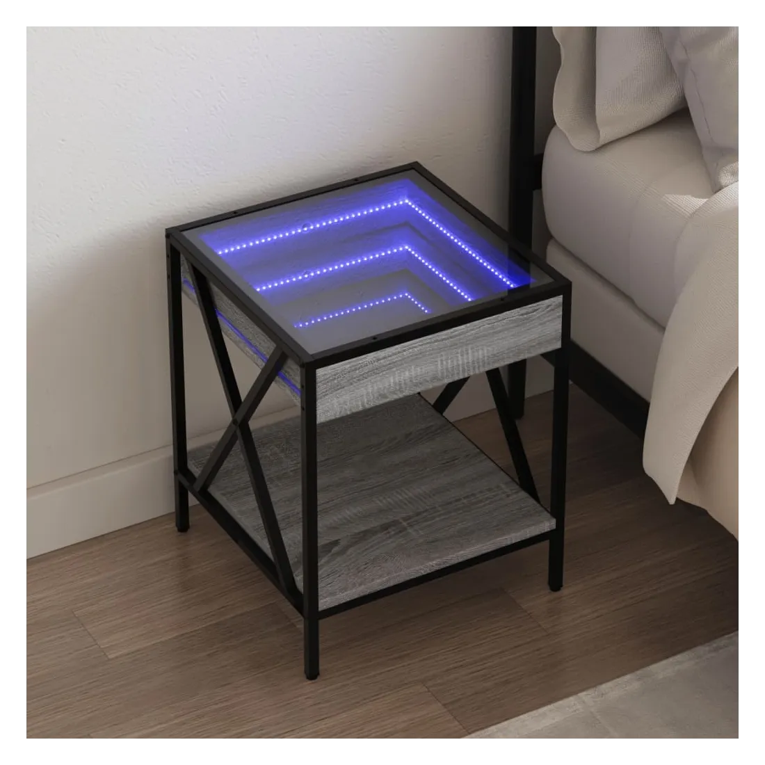 Cette table de chevet avec un miroir à LED infini constitue un ajout intemporel à votre décoration intérieure. Matériau stable et durable : le bois d'ingénierie est un matériau durable et stable dont la surface lisse résiste à l'humidité, à la déformation et au fendillement, ce qui en fait un choix fiable pour une grande variété de projets. Structure robuste : le cadre en métal de la table ajoute un style industriel à votre intérieur tout en garantissant robustesse, stabilité et longévité. Lampes LED RVB pour une ambiance agréable : cette table est dotée de lampes LED qui peuvent être facilement réglées pour créer un spectacle lumineux personnalisé. Vous pouvez personnaliser les modes, les couleurs et la luminosité pour améliorer l'ambiance de votre espace intérieur.Dessus de table stable et robuste : le dessus de table robuste est idéal pour placer vos objets décoratifs ou tout autre objet nécessaire à portée de main. Bon à savoir : Ce produit est doté d'un connecteur USB qui nécessite une source d'alimentation USB de 5V certifiée (non incluse).