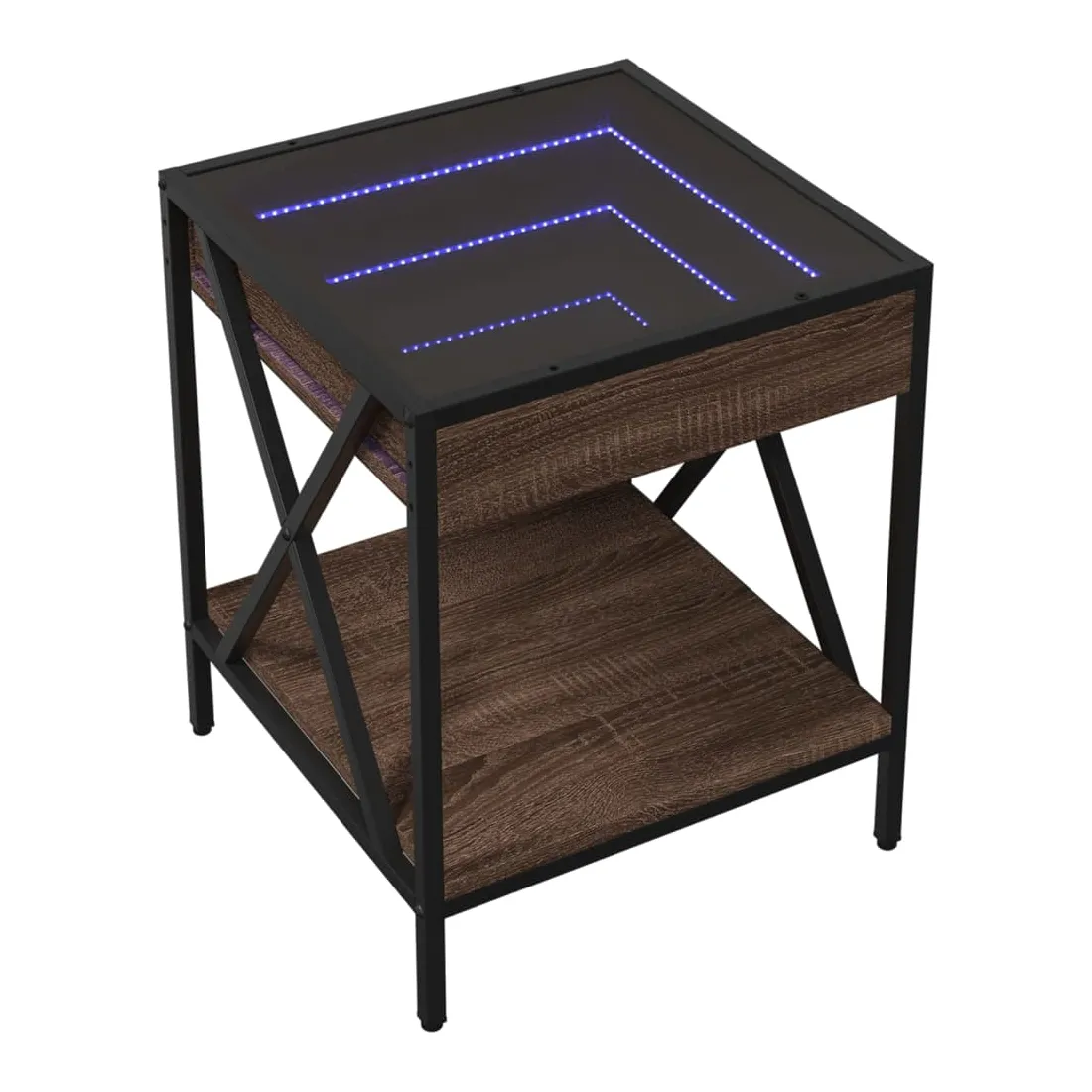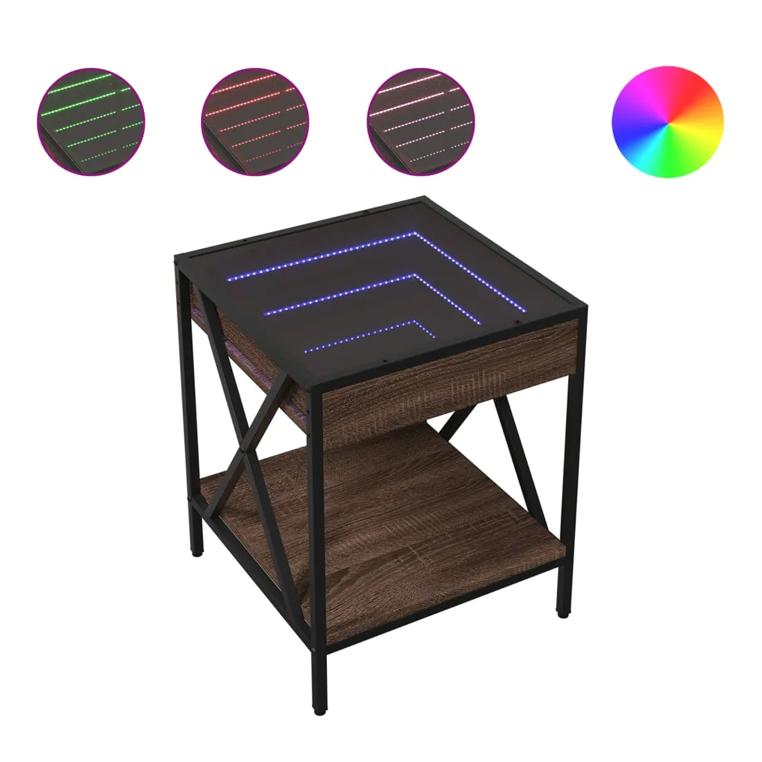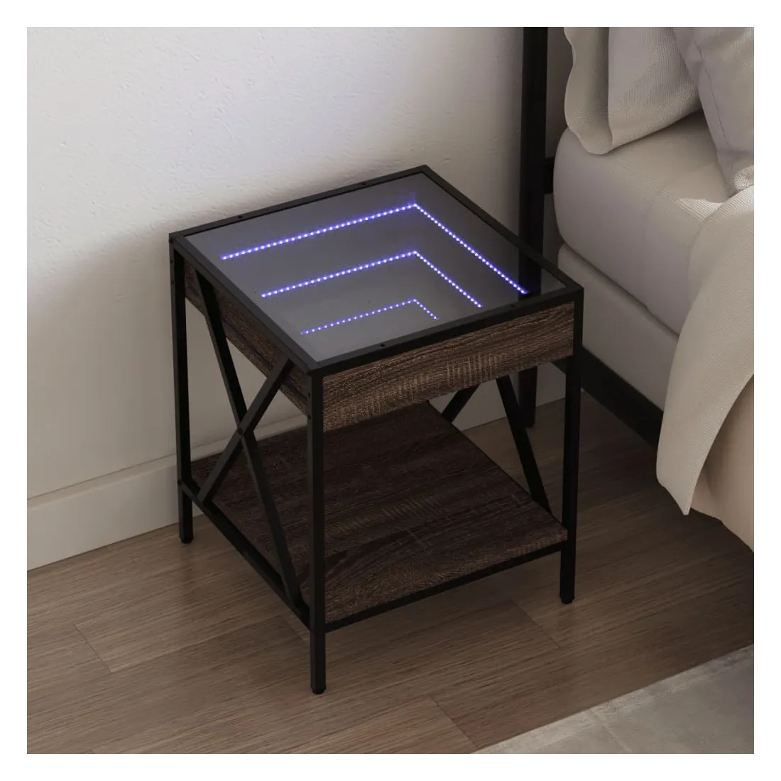 Cette table de chevet avec un miroir à LED infini constitue un ajout intemporel à votre décoration intérieure. Matériau stable et durable : le bois d'ingénierie est un matériau durable et stable dont la surface lisse résiste à l'humidité, à la déformation et au fendillement, ce qui en fait un choix fiable pour une grande variété de projets. Structure robuste : le cadre en métal de la table ajoute un style industriel à votre intérieur tout en garantissant robustesse, stabilité et longévité. Lampes LED RVB pour une ambiance agréable : cette table est dotée de lampes LED qui peuvent être facilement réglées pour créer un spectacle lumineux personnalisé. Vous pouvez personnaliser les modes, les couleurs et la luminosité pour améliorer l'ambiance de votre espace intérieur.Dessus de table stable et robuste : le dessus de table robuste est idéal pour placer vos objets décoratifs ou tout autre objet nécessaire à portée de main. Bon à savoir : Ce produit est doté d'un connecteur USB qui nécessite une source d'alimentation USB de 5V certifiée (non incluse).