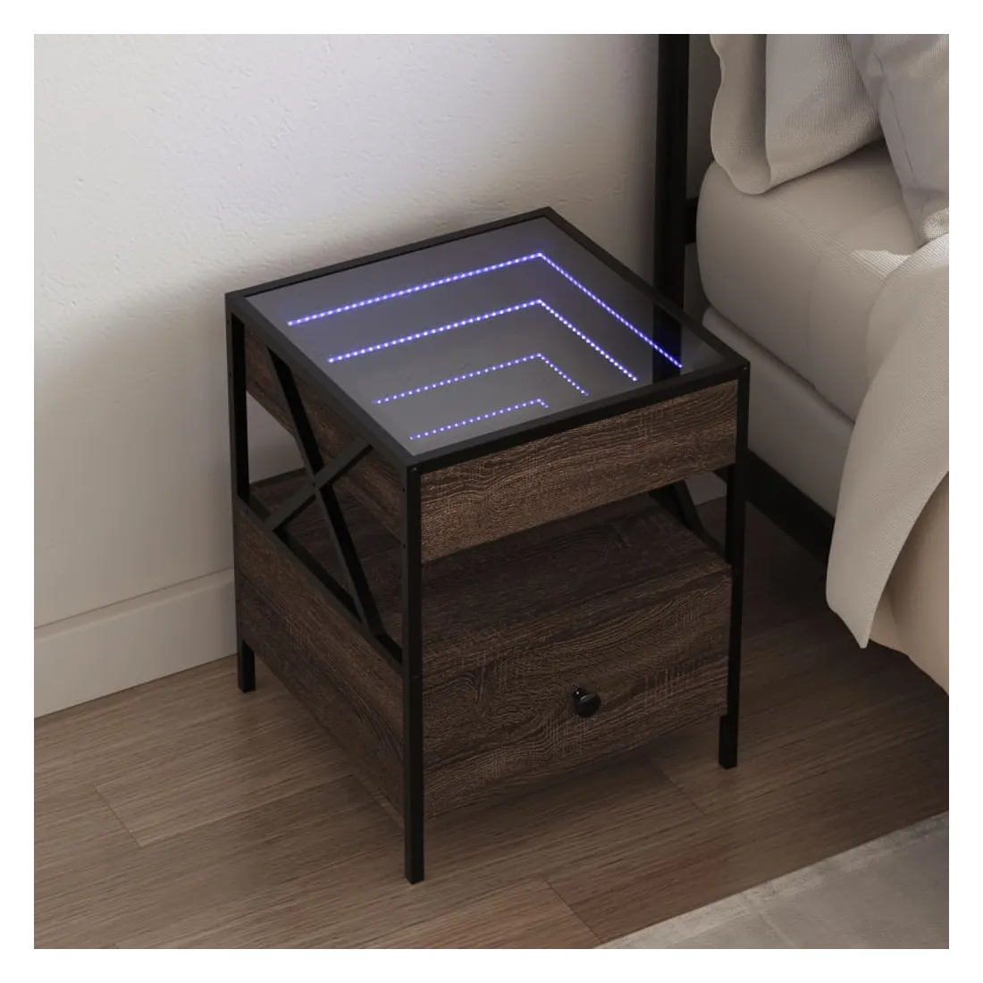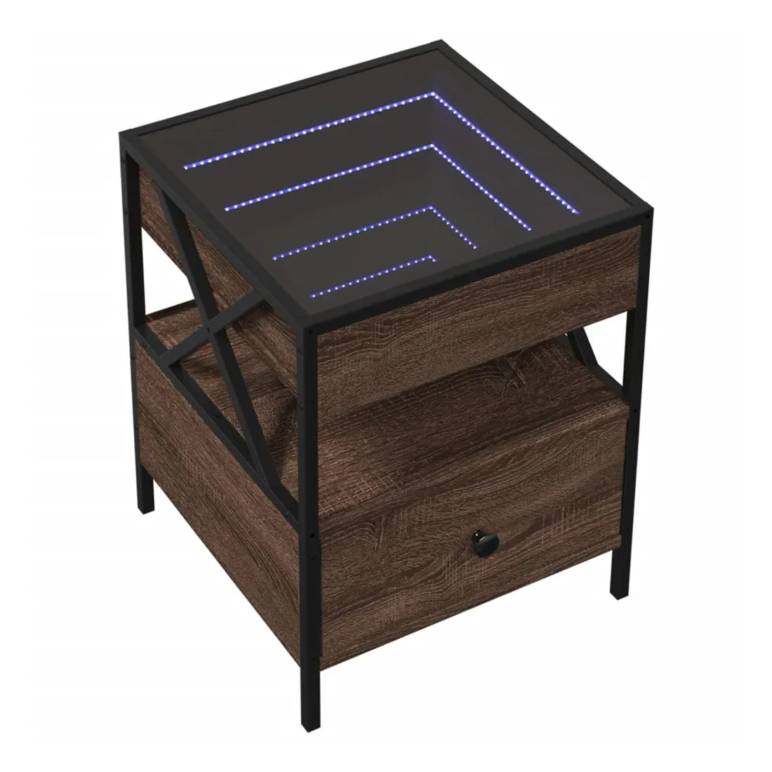 Cette table de chevet avec un miroir à LED infini constitue un ajout intemporel à votre décoration intérieure. Matériau stable et durable : le bois d'ingénierie est un matériau durable et stable dont la surface lisse résiste à l'humidité, à la déformation et au fendillement, ce qui en fait un choix fiable pour une grande variété de projets. Structure robuste : le cadre en métal de la table ajoute un style industriel à votre intérieur tout en garantissant robustesse, stabilité et longévité. Lampes LED RVB pour une ambiance agréable : cette table est dotée de lampes LED qui peuvent être facilement réglées pour créer un spectacle lumineux personnalisé. Vous pouvez personnaliser les modes, les couleurs et la luminosité pour améliorer l'ambiance de votre espace intérieur.Dessus de table stable et robuste : le dessus de table robuste est idéal pour placer vos objets décoratifs ou tout autre objet nécessaire à portée de main. Bon à savoir : Ce produit est doté d'un connecteur USB qui nécessite une source d'alimentation USB de 5V certifiée (non incluse).