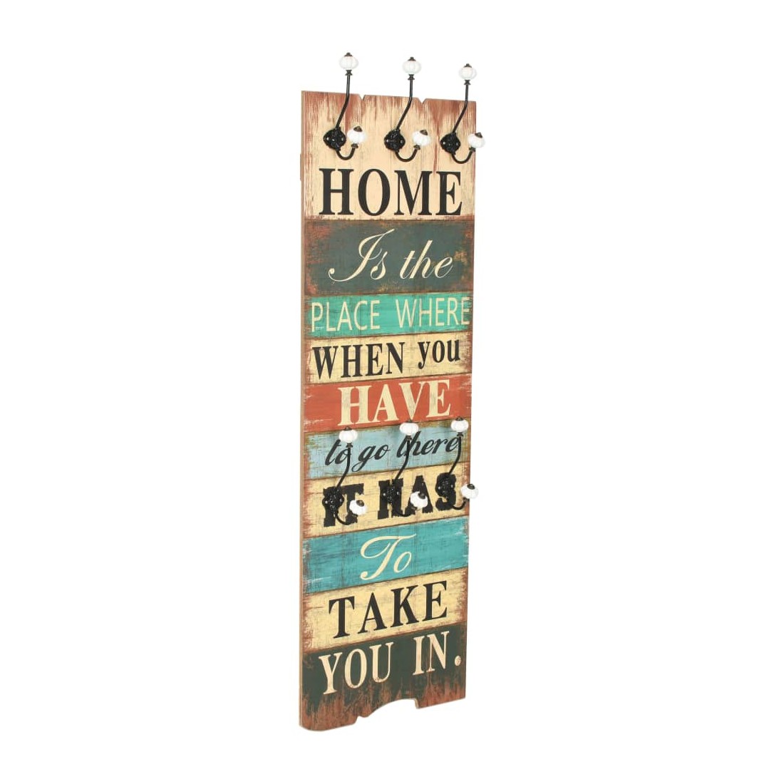 Avec son imprimé de style vintage, « Home is the place where when you have to go there, it has to take you in. », ce porte-manteau mural avec 6 crochets deviendra un article attrayant qui ravira immédiatement vos invités. Le porte-manteau est fabriqué en MDF, ce qui est très robuste. Conçu avec deux rangées de trois crochets en métal exquis, le porte-manteau offre amplement d'espace pour vos manteaux, sacs, foulards, chapeaux ou autres petits objets. Avec deux points d'attache à l'arrière, le porte-manteau peut être facilement monté sur le mur. L' assemblage est facile. La livraison comprend également le matériel de montage requis.