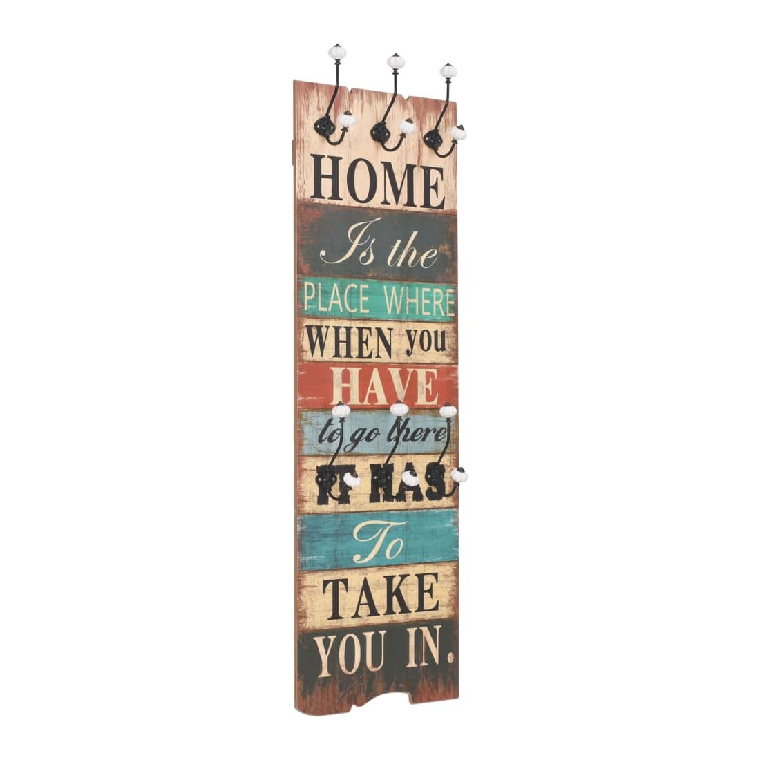 Avec son imprimé de style vintage, « Home is the place where when you have to go there, it has to take you in. », ce porte-manteau mural avec 6 crochets deviendra un article attrayant qui ravira immédiatement vos invités. Le porte-manteau est fabriqué en MDF, ce qui est très robuste. Conçu avec deux rangées de trois crochets en métal exquis, le porte-manteau offre amplement d'espace pour vos manteaux, sacs, foulards, chapeaux ou autres petits objets. Avec deux points d'attache à l'arrière, le porte-manteau peut être facilement monté sur le mur. L' assemblage est facile. La livraison comprend également le matériel de montage requis.