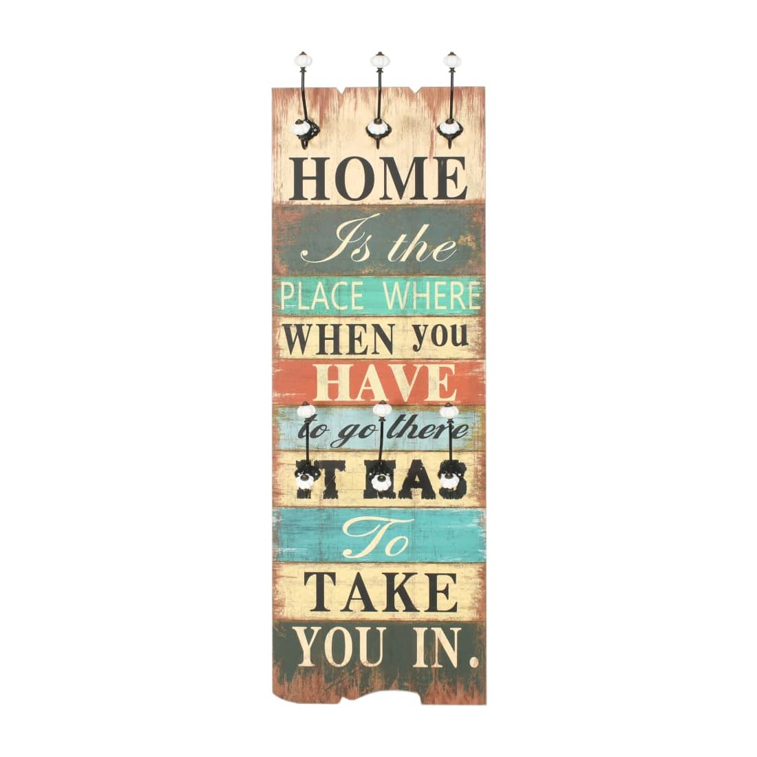 Avec son imprimé de style vintage, « Home is the place where when you have to go there, it has to take you in. », ce porte-manteau mural avec 6 crochets deviendra un article attrayant qui ravira immédiatement vos invités. Le porte-manteau est fabriqué en MDF, ce qui est très robuste. Conçu avec deux rangées de trois crochets en métal exquis, le porte-manteau offre amplement d'espace pour vos manteaux, sacs, foulards, chapeaux ou autres petits objets. Avec deux points d'attache à l'arrière, le porte-manteau peut être facilement monté sur le mur. L' assemblage est facile. La livraison comprend également le matériel de montage requis.