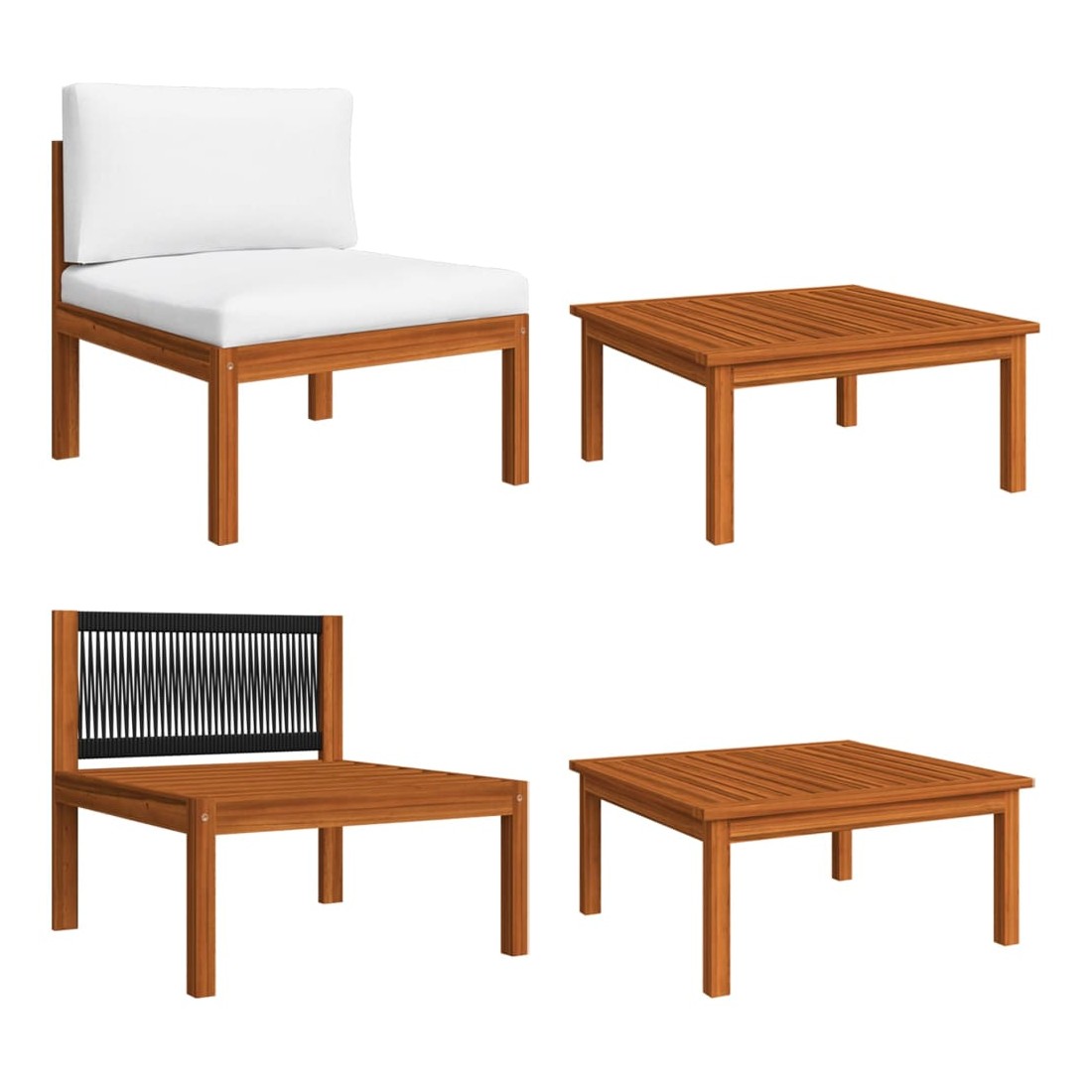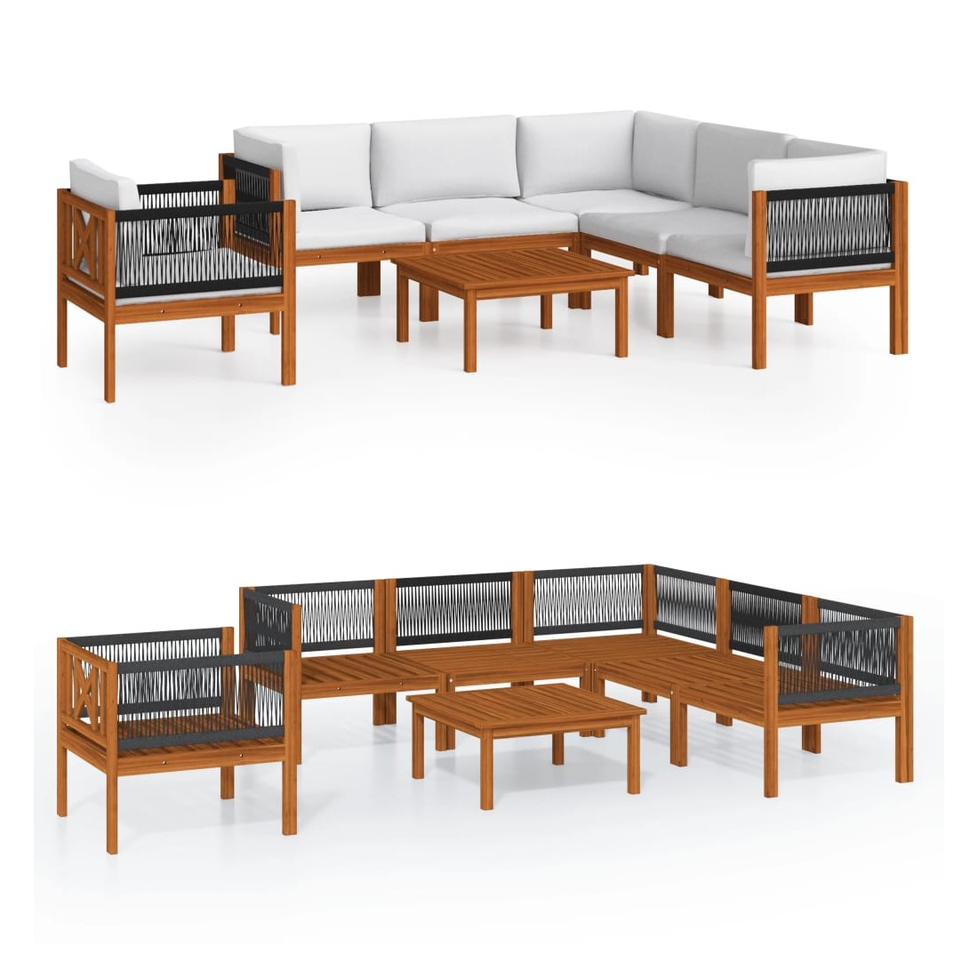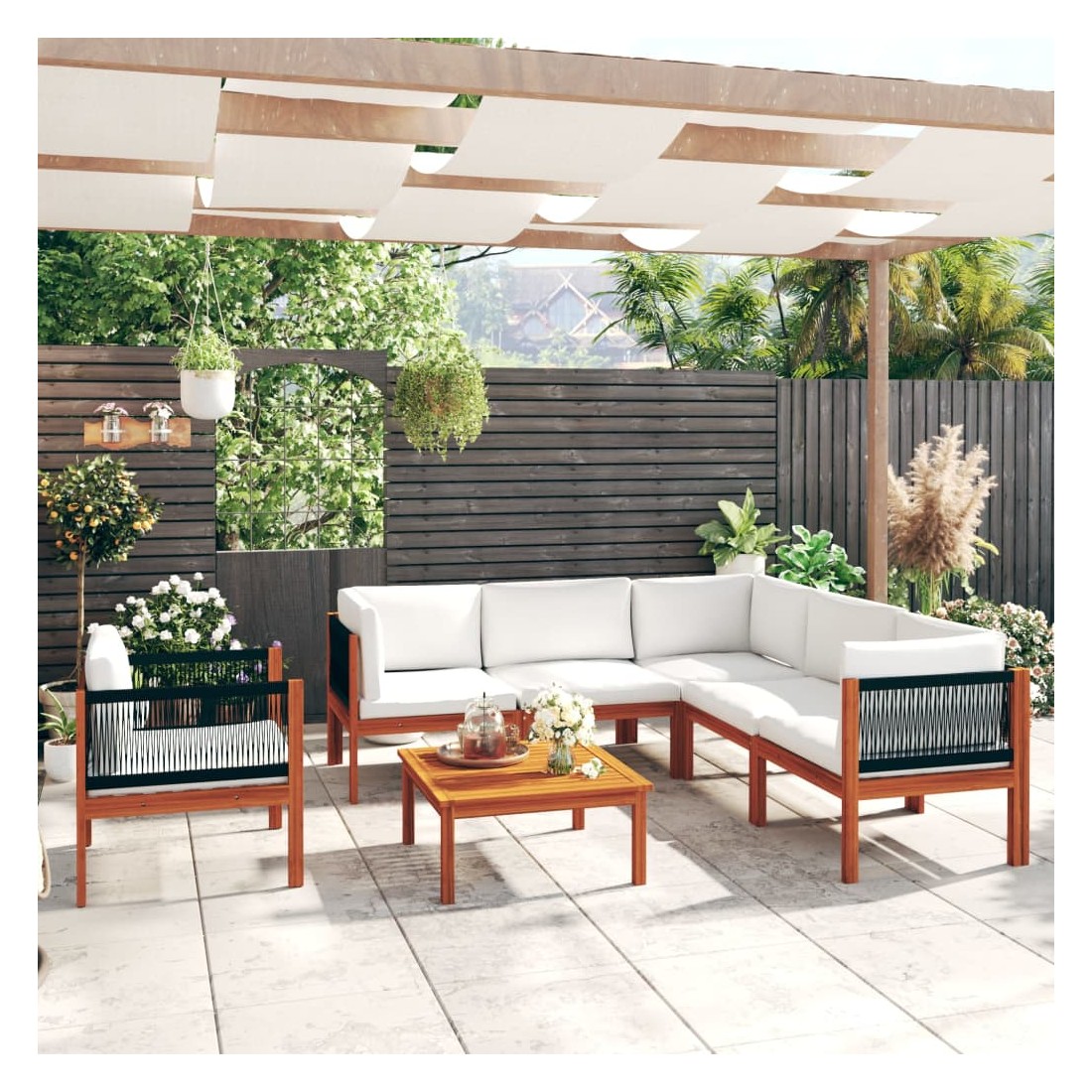 Salon de jardin 7 pièces avec coussins, bois d'acacia crème et corde