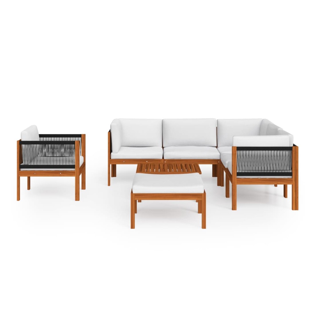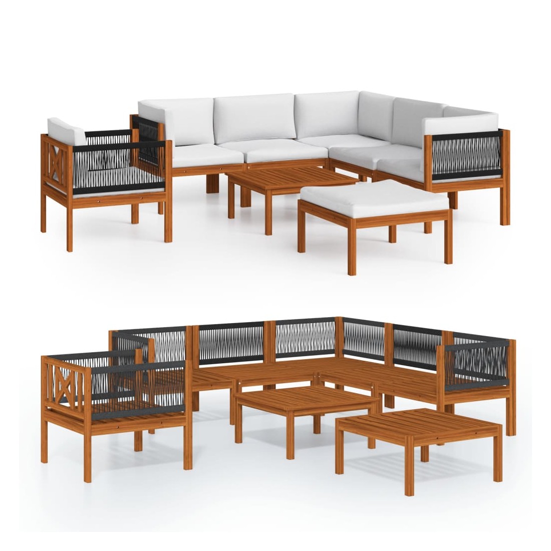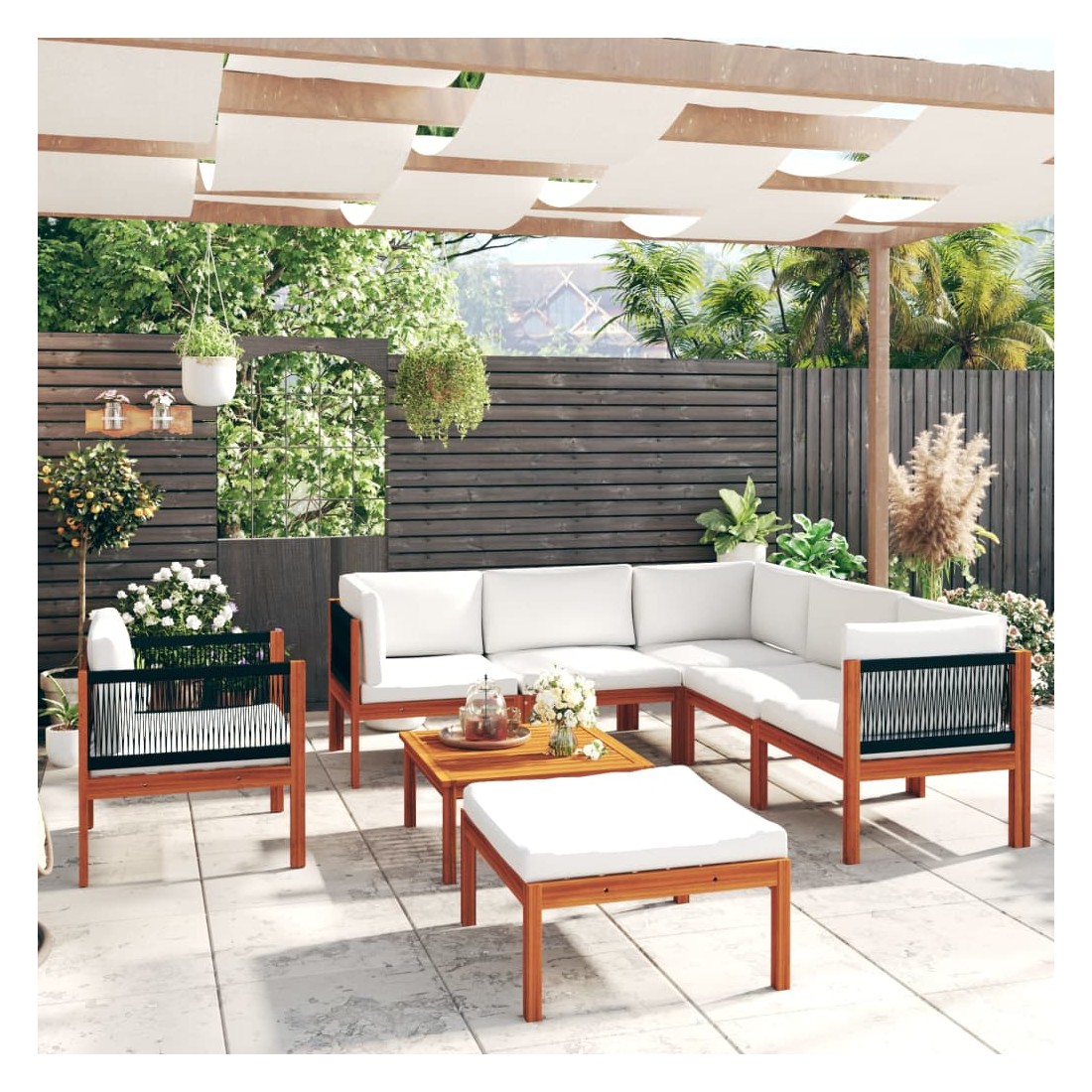 Ce salon de jardin avec dossiers en corde tressée sera idéal pour vous détendre et profiter du beau temps, faire une sieste ou discuter en famille ou entre amis. Avec son design intemporel, ce salon en bois apportera une touche de charme rustique à votre terrasse, jardin ou salon. Ce canapé de jardin est doté de dossiers en corde finement travaillés, ajoutant une touche sophistiquée à tout espace extérieur. Cet ensemble de jardin est fabriqué en bois d'acacia massif de haute qualité, un bois dur tropical résistant aux intempéries et très durable. Grâce à sa finition à l'huile, ce salon de jardin arbore une couleur chaleureuse et est facile à nettoyer et à entretenir. De plus, la livraison comprend des coussins d'assise et de dossier épais pour un confort optimal.