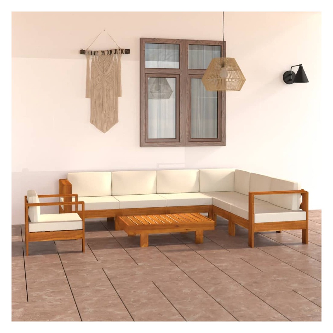 Décorez votre cour, transformez-la en un endroit accueillant pour vous asseoir et apprécier votre environnement ! Le salon de jardin en bois est un choix idéal pour vous détendre et vivre du bon temps avec vos amis ou votre famille dans le jardin, sur le patio ou le balcon. Le salon d'extérieur est soigneusement fabriqué en bois d'acacia massif, ce qui le rend robuste, durable et adapté à une utilisation en plein air. Les coussins de siège et les coussins de dossier bien rembourrés offrent un confort supplémentaire pendant votre temps de détente. La surface à finition à l'huile est facile à nettoyer avec un chiffon humide. De plus, le dessus de table robuste est idéal pour placer les boissons et les aliments à portée de main. Remarque : afin de prolonger la durée de vie des meubles d'extérieur, nous vous recommandons de les protéger avec une housse imperméable.