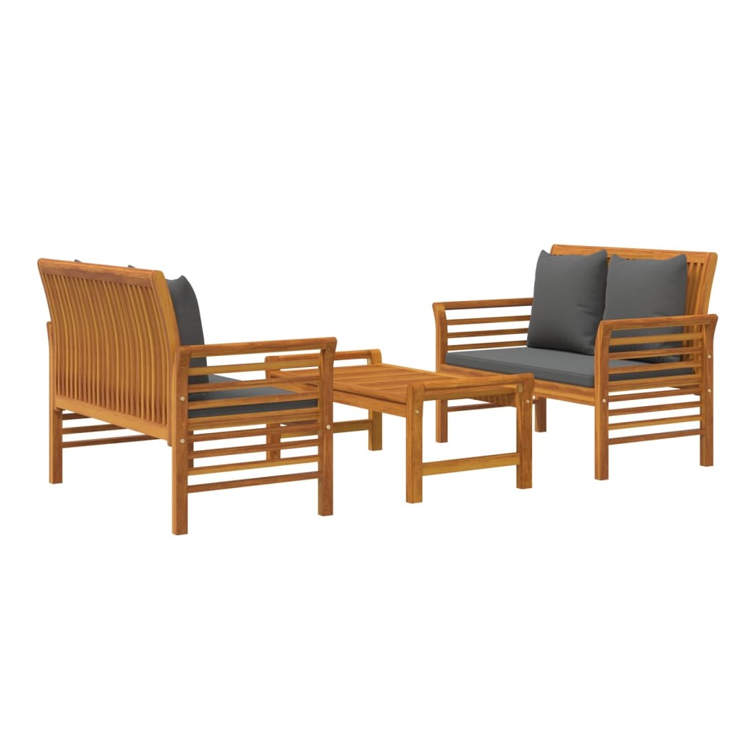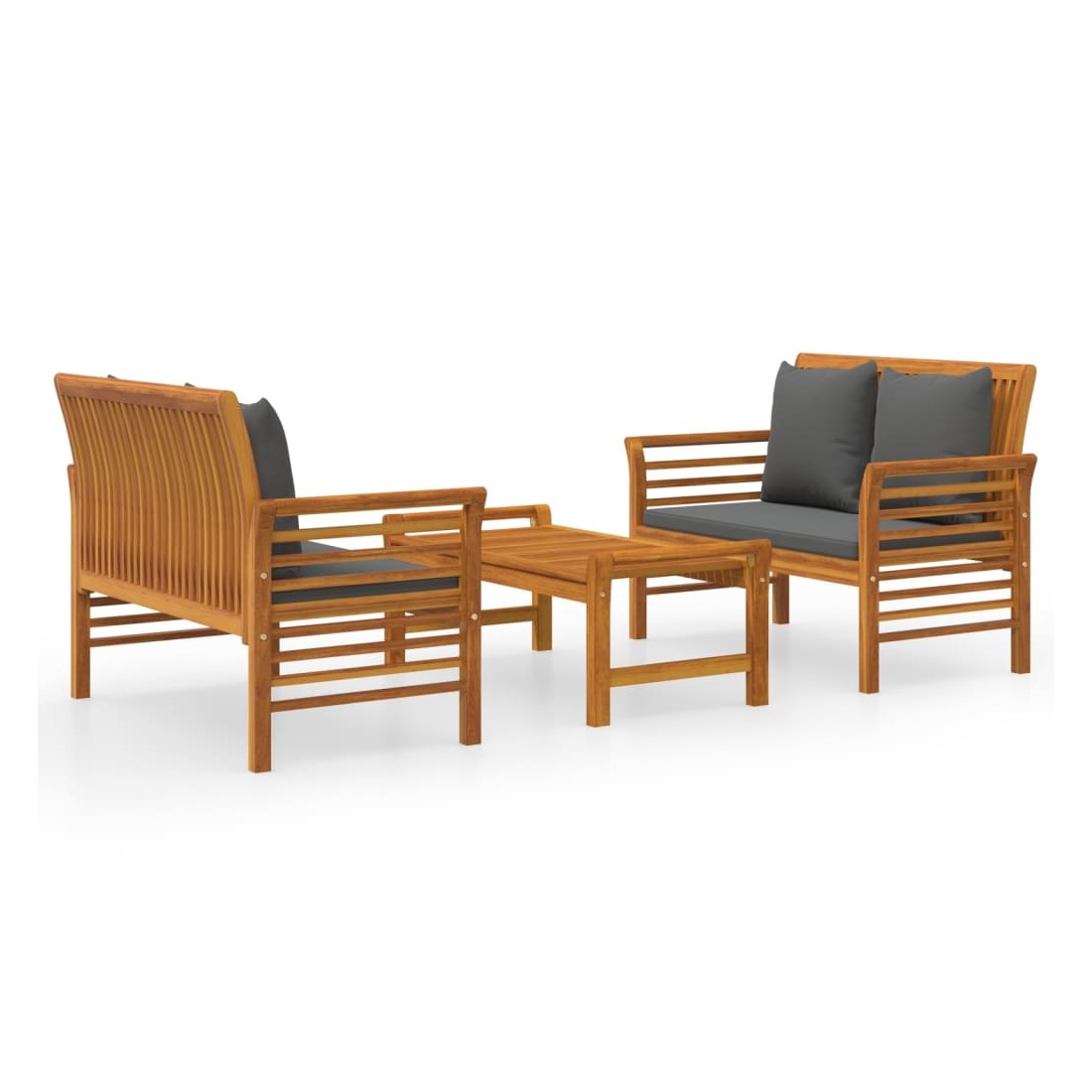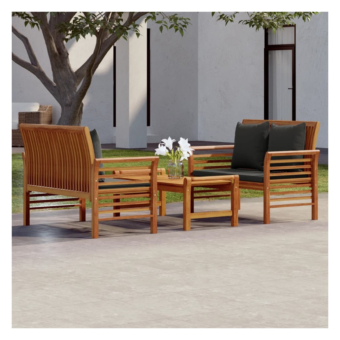 Ce salon de jardin combine style et fonctionnalité et est un choix idéal pour vous détendre, profiter du beau temps, faire une sieste ou discuter avec votre famille ou vos amis. Matériau pratique : le bois d'acacia massif est un matériau naturel magnifique. Le bois d'acacia un bois dur tropical, qui est dense, robuste et durable.Confort supplémentaire : grâce à la tapisserie 100 % polyester et au rembourrage épais, les coussins inclus sont doux et offrent le plus grand confort.Table de loisirs idéale : avec un dessus robuste, la table est idéale pour garder la nourriture et les boissons à portée de main lorsque vous vous détendez en plein air. Remarque :Afin de prolonger la durée de vie de votre mobilier d'extérieur, nous vous recommandons de le protéger avec une housse imperméable.Chaque produit est livré avec un manuel de montage dans la boîte pour un montage facile.
