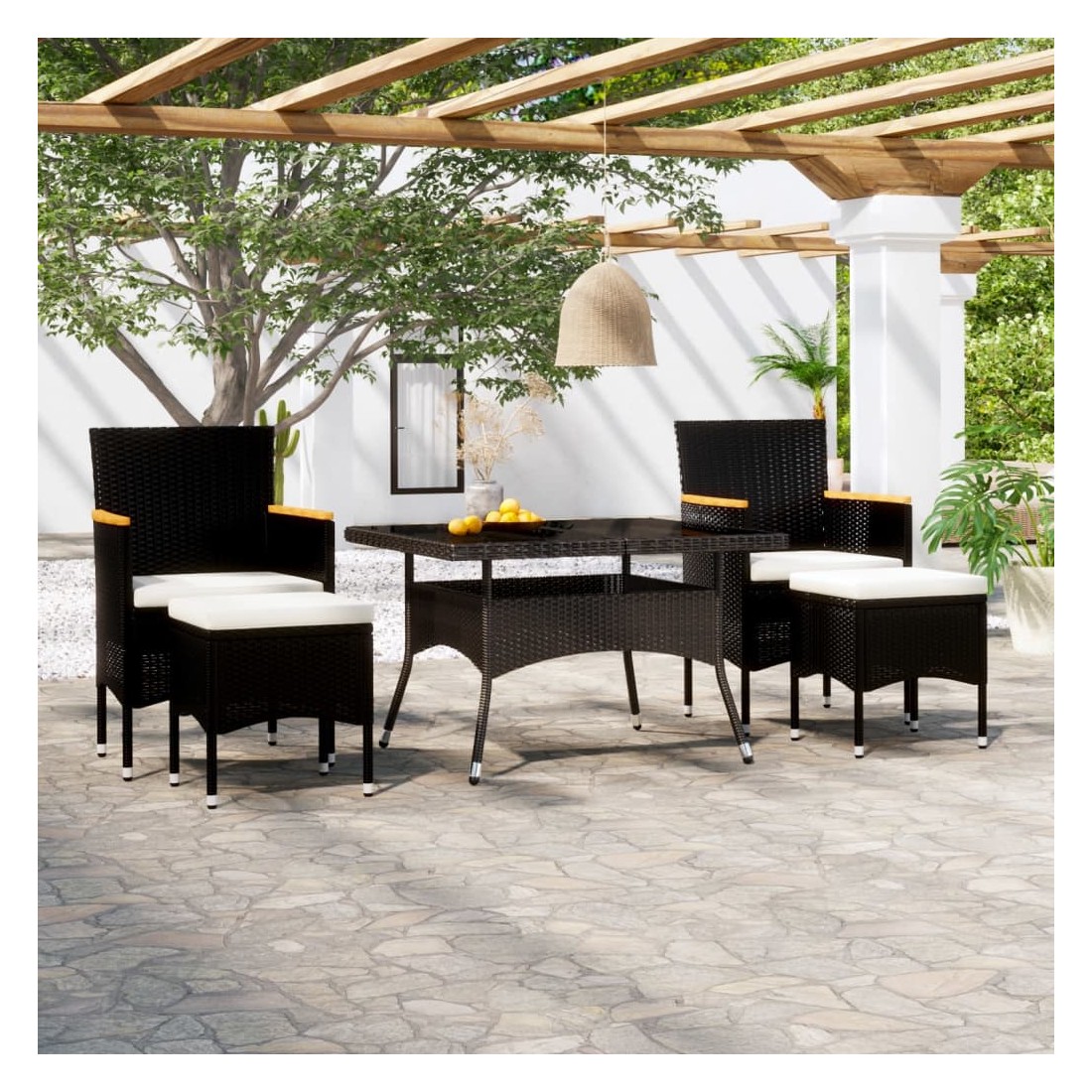 Cet ensemble élégant de salle à manger de jardin vous permet de passer des moments agréables et confortables avec votre famille et vos amis. Avec un cadre en acier enduit de poudre recouvert de résine tressée résistante aux intempéries avec protection UV, la table et les chaises sont durables et stables. Conçues avec un dossier et des accoudoirs incurvés, les chaises vous offrent du confort. Les coussins sont inclus pour plus de confort et la housse à fermeture éclair est amovible pour un lavage facile. Le dessus de table est en verre trempé renforcé avec un support résistant, facile à nettoyer et à entretenir. Les deux repose-pieds vous offrent également des places d'assise supplémentaires. De plus, la construction légère rend chaque pièce facile à déplacer, à réorganiser et à transporter. Remarque : afin de prolonger la durée de vie des meubles d'extérieur, nous vous recommandons de les protéger avec une housse imperméable.