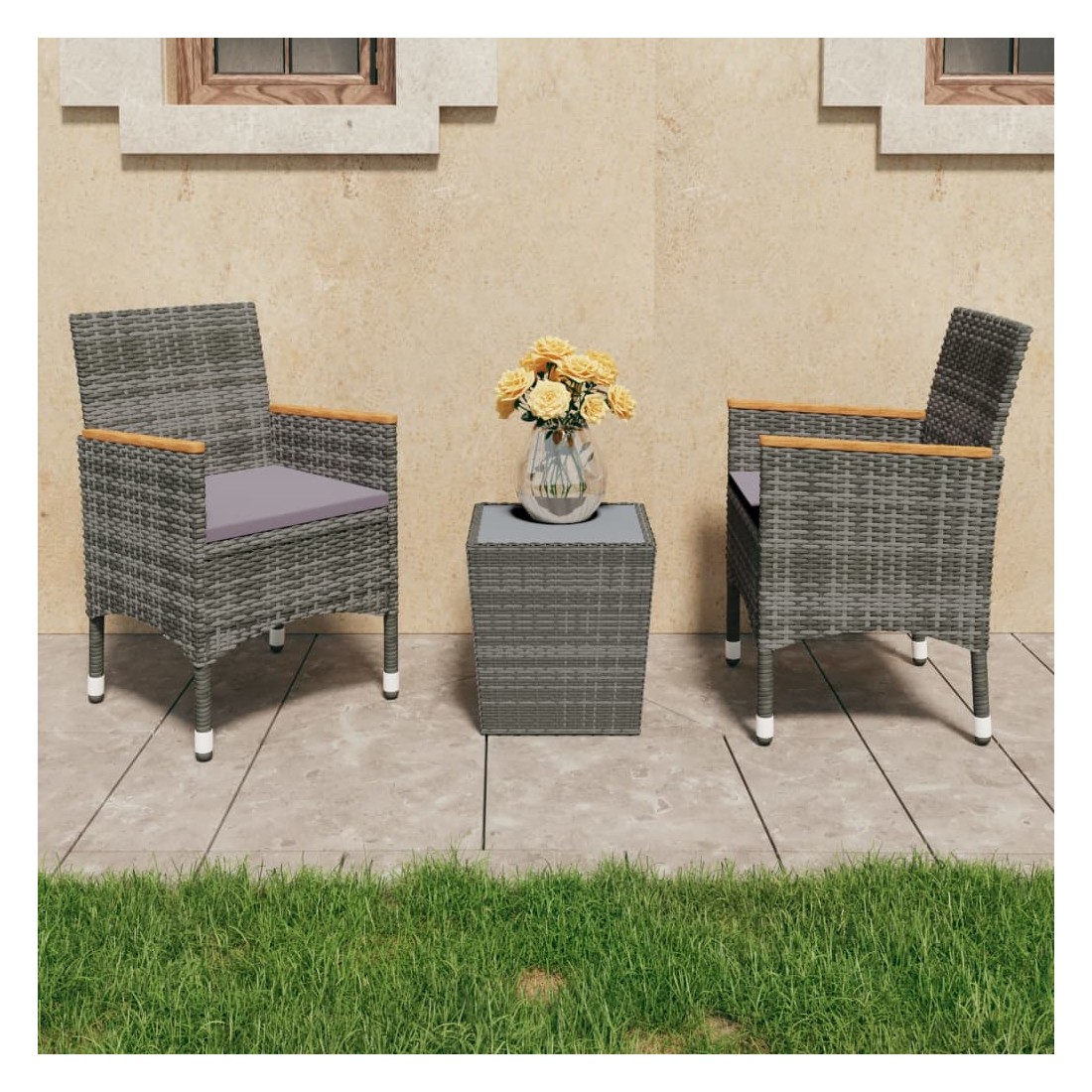 Ensemble de bistro 3 pcs Résine tressée et verre trempé Gris