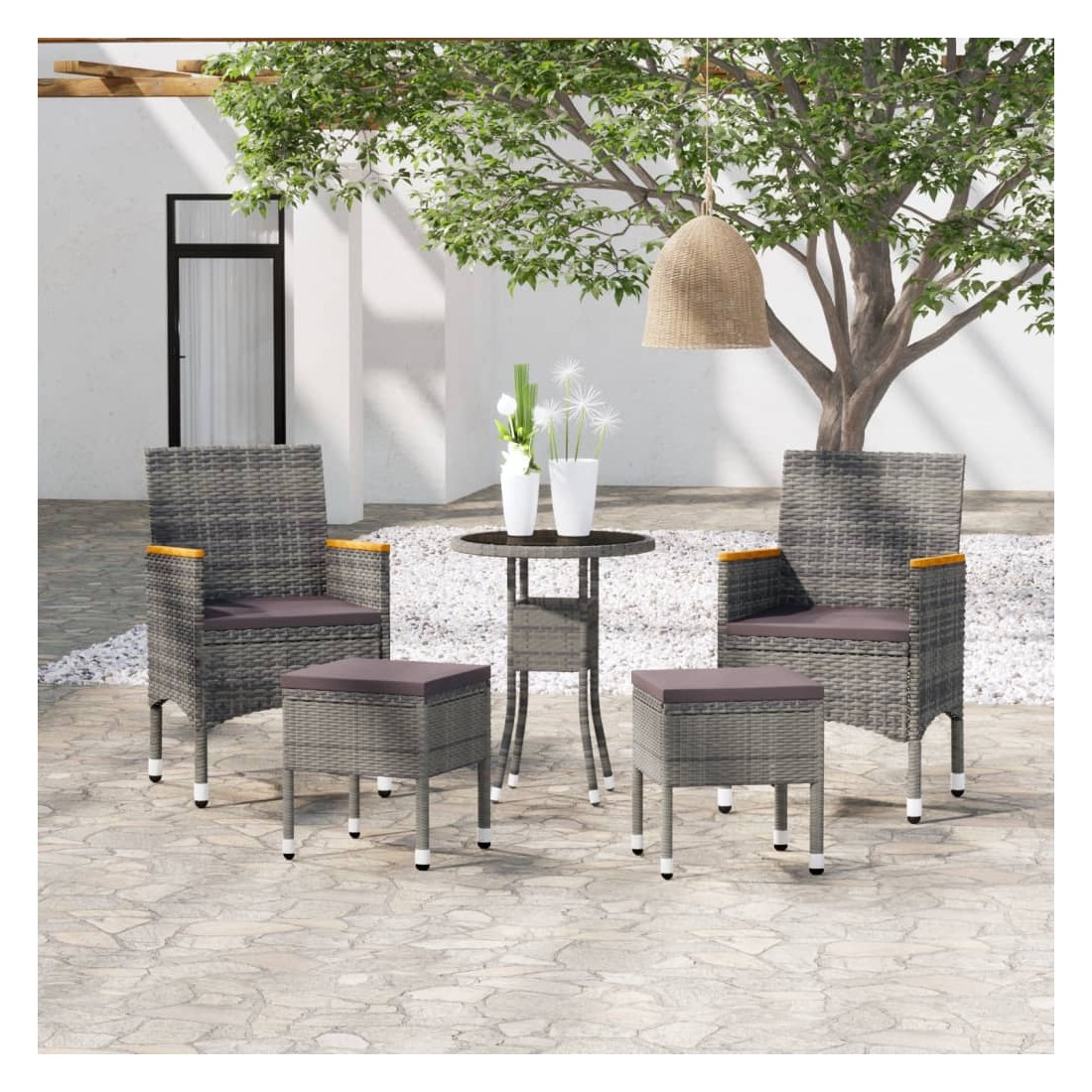 Ajoutez une touche de style moderne avec cet ensemble de meubles de jardin, conçu pour compléter n'importe quel espace, tel que le patio, le bord de la piscine, le porche, la terrasse et le balcon. Avec un cadre en acier enduit de poudre enveloppé en résine tressée, cet ensemble de meubles d'extérieur est durable. De plus, le coussin d'assise bien rembourré ajoute un confort supplémentaire à la chaise. Remarque : afin de prolonger la durée de vie des meubles d'extérieur, nous vous recommandons de les protéger avec une housse imperméable.