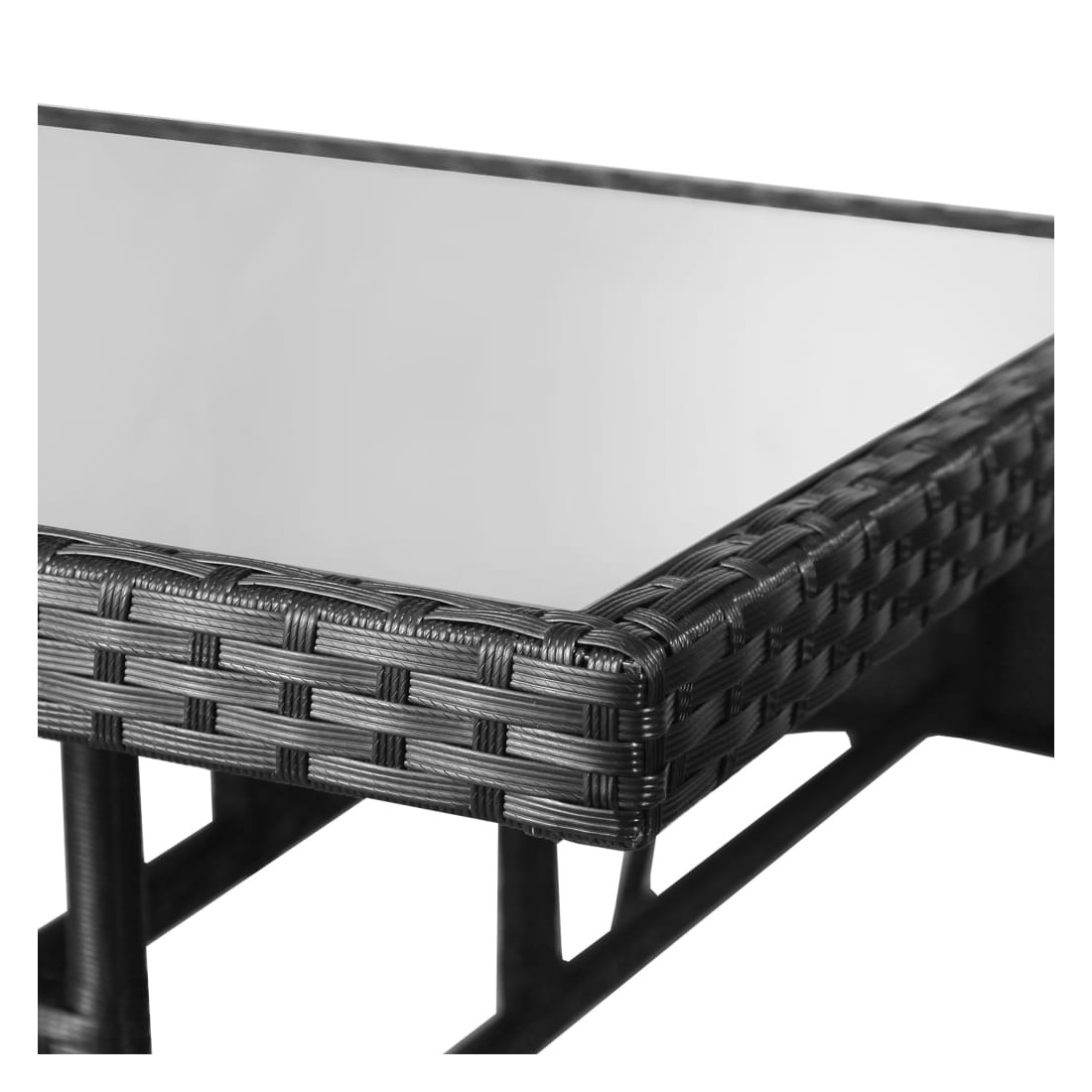 Créez un aspect convaincant et cohérent dans votre espace extérieur avec cet ensemble de salle à manger de jardin en résine tressée ! La table et les chaises à dîner sont en résine tressée sans entretien, ce qui les rend faciles à nettoyer avec un chiffon humide et parfaites pour une utilisation en plein air. Grâce à leurs cadres en acier, la table et les chaises sont stables et sûres. Le dessus de table en verre ajoute également une touche luxueuse à votre espace extérieur. De plus, les coussins de siège amovibles sont très confortables. Remarque : Nous vous recommandons de couvrir l'ensemble de salle à manger pendant la pluie, la neige et le gel pour une utilisation durable.