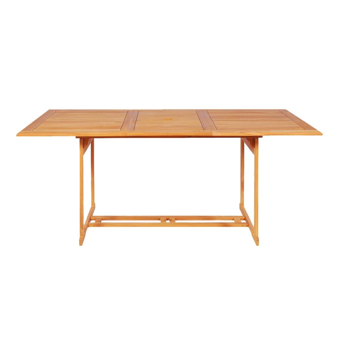 Cet ensemble de jardin en bois est parfait pour vos repas ou pour vous détendre dans le jardin ou sur le patio. Il est également idéal pour une utilisation à l'intérieur. Fabriquée en bois dur de teck extrêmement durable, cette pièce de meuble en teck a été chevronnée, séchée au four puis finement poncée pour lui donner un aspect très lisse. Le bois de teck est connu pour sa résistance exceptionnelle aux intempéries, ce qui le rend bien plus adapté aux meubles de jardin que tout autre type de bois. Le bois de teck est le choix idéal si vous souhaitez acheter une pièce de meubles de jardin durable. L’ensemble est appliqué avec une belle finition pour donner au bois une couleur chaude. La table comprend un trou pour un parasol afin de vous protéger du soleil. Les dossiers des chaises sont réglables en 7 positions, de sorte que vous puissiez toujours trouver la position la plus confortable. Avec un design pliable, les chaises peuvent être pliées pour économiser de l’espace lorsqu'elles ne sont pas utilisées. Elles sont également légères et faciles à déplacer. L’ensemble de meubles vous offre un confort et une grande commodité pour passer du temps avec votre famille et vos amis. De plus, cet ensemble est également facile à nettoyer avec un chiffon humide.