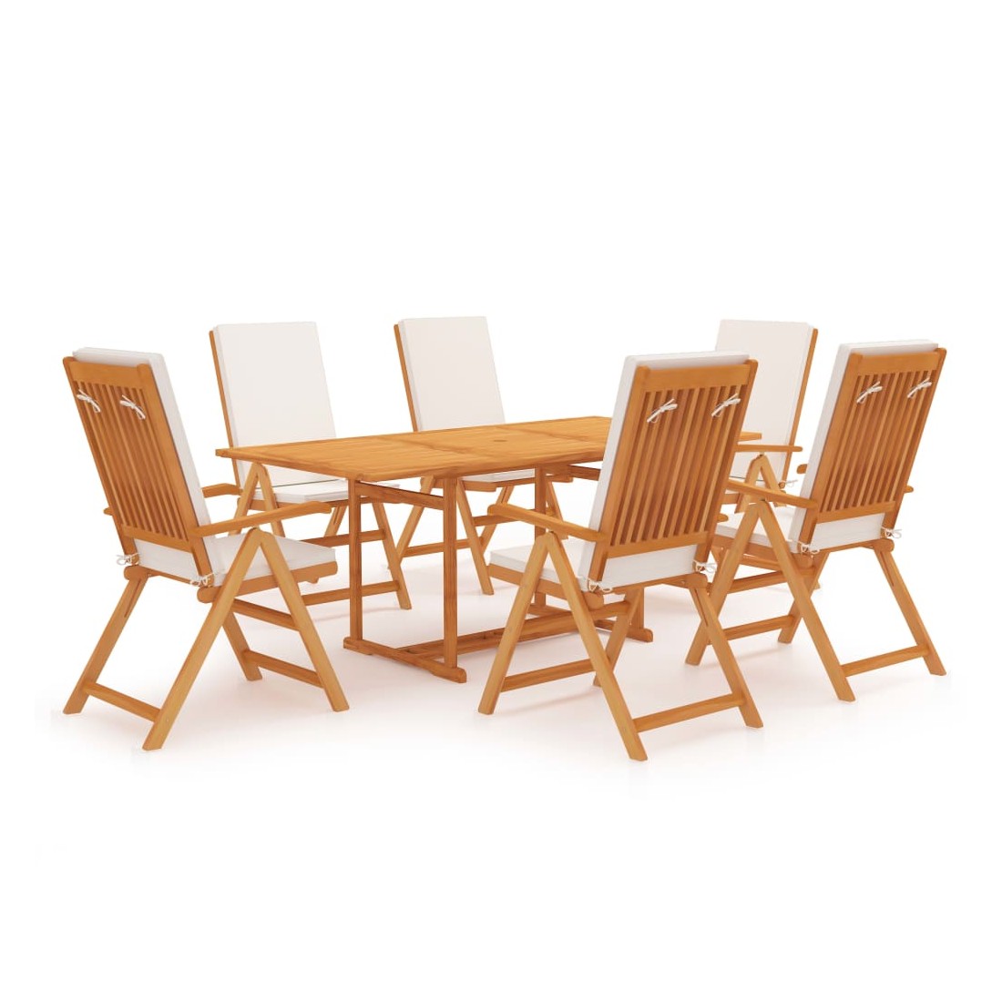 Cet ensemble de jardin en bois est parfait pour vos repas ou pour vous détendre dans le jardin ou sur le patio. Il est également idéal pour une utilisation à l'intérieur. Fabriquée en bois dur de teck extrêmement durable, cette pièce de meuble en teck a été chevronnée, séchée au four puis finement poncée pour lui donner un aspect très lisse. Le bois de teck est connu pour sa résistance exceptionnelle aux intempéries, ce qui le rend bien plus adapté aux meubles de jardin que tout autre type de bois. Le bois de teck est le choix idéal si vous souhaitez acheter une pièce de meubles de jardin durable. L’ensemble est appliqué avec une belle finition pour donner au bois une couleur chaude. La table comprend un trou pour un parasol afin de vous protéger du soleil. Les dossiers des chaises sont réglables en 5 positions, de sorte que vous puissiez toujours trouver les positions les plus confortables. Avec un design pliable, les chaises peuvent être pliées pour économiser de l’espace lorsqu'elles ne sont pas utilisées. Elles sont également légères et faciles à déplacer. Les coussins bien rembourrés offrent le plus grand confort et les housses de coussin sont amovibles pour un lavage facile. L’ensemble de meubles vous offre un confort et une grande commodité pour passer du temps avec votre famille et vos amis. De plus, cet ensemble est également facile à nettoyer avec un chiffon humide.
