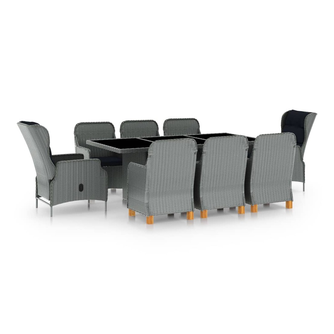 Cet ensemble à manger d'extérieur est une combinaison parfaite de style et de fonctionnalité et est destiné à être le point de mire de votre jardin, balcon ou patio. L’ensemble de meubles est fait de résine tressée ronde légère et peu exigeante d’entretien, ce qui le rend parfait pour une utilisation à l'extérieur, facile à nettoyer avec un chiffon humide. Grâce à sa structure en acier enduit de poudre, les chaises et la table sont stables et durables. Le dessus en verre ajoute une touche de luxe à votre espace extérieur, parfait pour dîner ou placer des objets décoratifs. Les coussins bien rembourrés ajoutent du confort supplémentaire pendant votre temps de détente. La housse de coussin est équipée d'une fermeture éclair, amovible et lavable. Grâce au mécanisme de levage à gaz, le dossier de la chaise inclinable est également réglable pour s’adapter à vos positions. En appuyant sur le bouton sur le côté, le dossier peut s’incliner, pour une position couchée confortable. Remarque : Nous vous recommandons de couvrir l'ensemble pendant la pluie, la neige ou le gel.