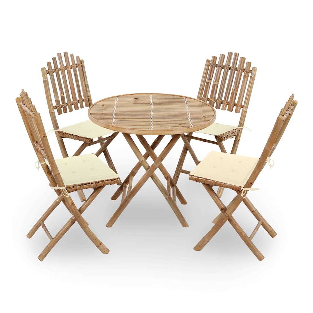 Cet ensemble de salle à manger en bambou avec coussins a un design élégant et ajoutera une touche de charme rustique à votre repas. Fabriqué en bambou massif, l'ensemble de salle à manger de jardin est résistant et durable. Il est également résistant aux intempéries et imperméable, et facile à nettoyer avec un chiffon humide. La table et les chaises sont toutes pliables pour économiser de l'espace de stockage lorsqu'elles ne sont pas utilisées. De plus, les coussins fournis offrent du confort supplémentaire lors de la détente. Il est composé à 100 % de polyester qui a été traité pour le rendre résistant à l'eau. Chaque coussin a deux jeux de cordes pour le fixer fermement sur la chaise de salle à manger.
