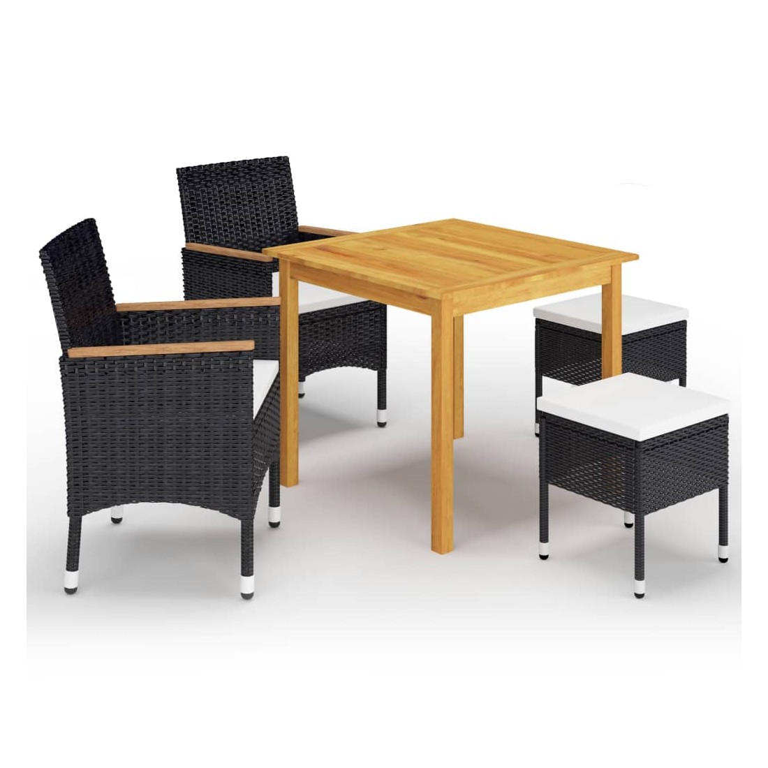 Créez une esthétique convaincante et uniforme dans votre espace extérieur avec cet ensemble de salle à manger de jardin ! La table de salle à manger est en bois d’acacia massif avec une finition à l’huile, ce qui la rend stable, durable et facile à entretenir. Dotés d’un cadre en acier enduit de poudre recouvert de résine tressée résistante aux intempéries, ces chaises et tabourets sont robustes et faciles à nettoyer. Conçue avec un dossier et des accoudoirs incurvés, la chaise à dîner a une forme plus ergonomique pour un confort maximal. De plus, les accoudoirs sont joliment décorés avec du bois d'acacia massif, ce qui apporte une touche de charme rustique. Chaque siège est doté d'un coussin rembourré amovible pour ajouter du confort pendant votre temps de détente. Remarque importante