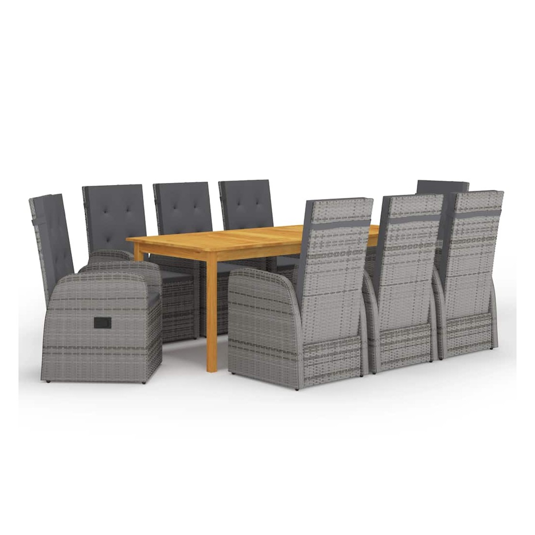 Créez une esthétique convaincante et uniforme dans votre espace extérieur avec cet ensemble de salle à manger de jardin ! La table de salle à manger est fabriquée en bois d’acacia massif avec une finition à l’huile, ce qui la rend stable, durable et facile à entretenir. Dotées d’un cadre en acier enduit de poudre recouvert de résine tressée résistante aux intempéries, ces chaises de salle à manger sont robustes et faciles à nettoyer. Le dossier s’inclinera en tirant sur le bouton situé sur le côté. Grâce à leur construction légère, les chaises sont faciles à déplacer. Elles sont également livrées avec des coussins hautement confortables et bien rembourrés pour un confort suprême. Les housses en polyester nécessitant peu d'entretien peuvent également être enlevées et lavées. Remarque importante : Nous vous recommandons de couvrir l'ensemble de salle à manger pendant la pluie, la neige et le gel pour une utilisation durable.