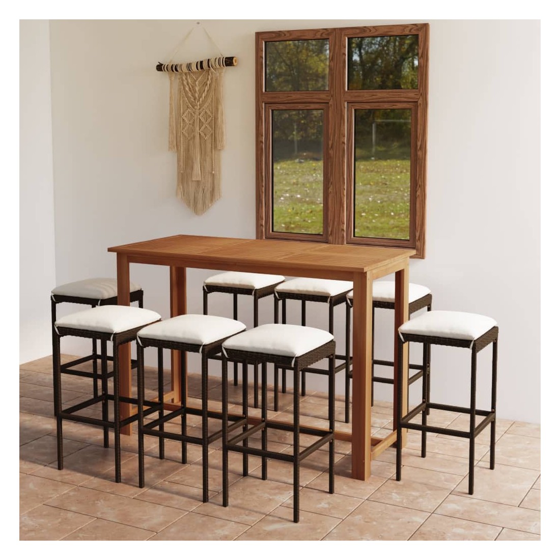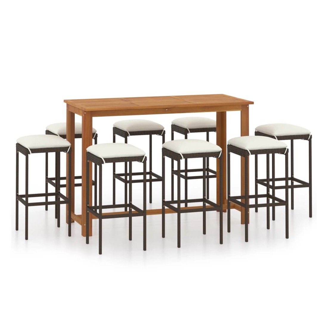 Cet ensemble de bar de jardin a un design élégant et sera le point de mire de votre jardin, patio ou terrasse. La table est fabriquée en bois d’acacia massif avec une finition à l’huile, ce qui la rend stable, durable et facile à entretenir. Doté d’un cadre en acier enduit de poudre recouvert de résine tressée résistante aux intempéries, ce tabouret de bar est robuste et facile à nettoyer. Les coussins de siège épais et amovibles sont très confortables. Les housses de coussin avec fermeture éclair peuvent être facilement enlevées et lavées. Remarque : nous vous recommandons de couvrir l'ensemble pendant la pluie, la neige et le gel.