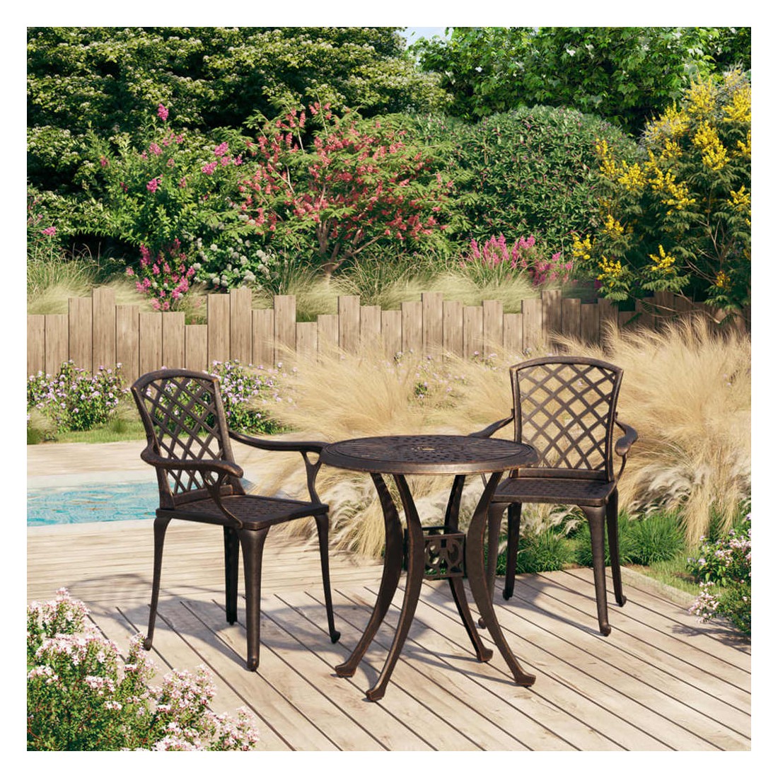 Cet ensemble de bistro, fabriqué en aluminium coulé, offre une expérience d'assise confortable pour vous et vos invités. Les chaises et la table d’extérieur, en aluminium coulé, sont robustes et durables. Le matériau résistant à la rouille et aux intempéries rend le mobilier idéal pour une utilisation à l'extérieur. Les magnifiques motifs font de l'ensemble de bistro un supplément élégant à votre espace extérieur. De plus, la table basse dispose d’un trou de parasol qui peut parfaitement accueillir votre parasol pour vous protéger du soleil ou de la pluie. Remarque : afin de prolonger la durée de vie des meubles d'extérieur, nous vous recommandons de les protéger avec une housse imperméable.