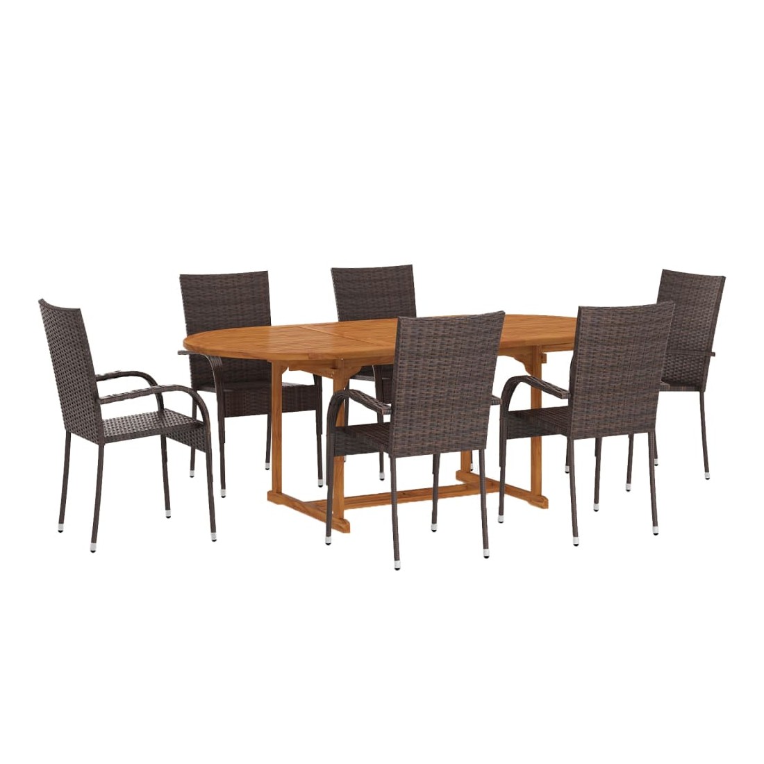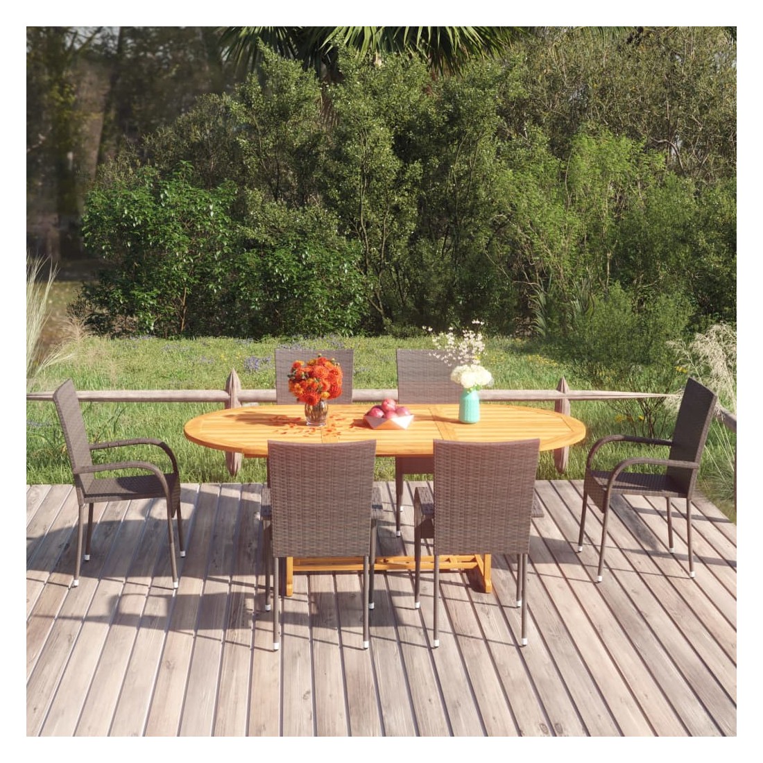 Créez une esthétique convaincante et uniforme dans votre espace extérieur avec cet ensemble de salle à manger de jardin ! La table d’extérieur est fabriquée en bois d’acacia massif, ce qui la rend robuste et stable. La surface à finition à l'huile rend également la table facile à nettoyer avec un chiffon humide. Dotées d’un cadre en acier recouvert de résine tressée résistante aux intempéries, les chaises sont robustes et faciles à nettoyer. Les chaises de jardin peuvent être empilées pour économiser de l’espace lorsqu'elles ne sont pas utilisées. Remarque : afin de prolonger la durée de vie des meubles d'extérieur, nous vous recommandons de les protéger avec une housse imperméable.