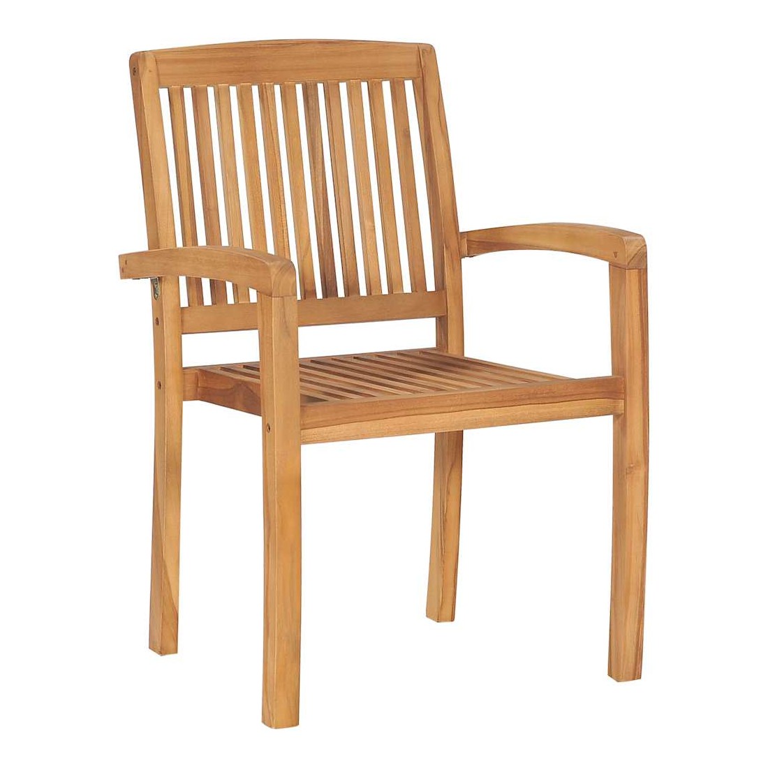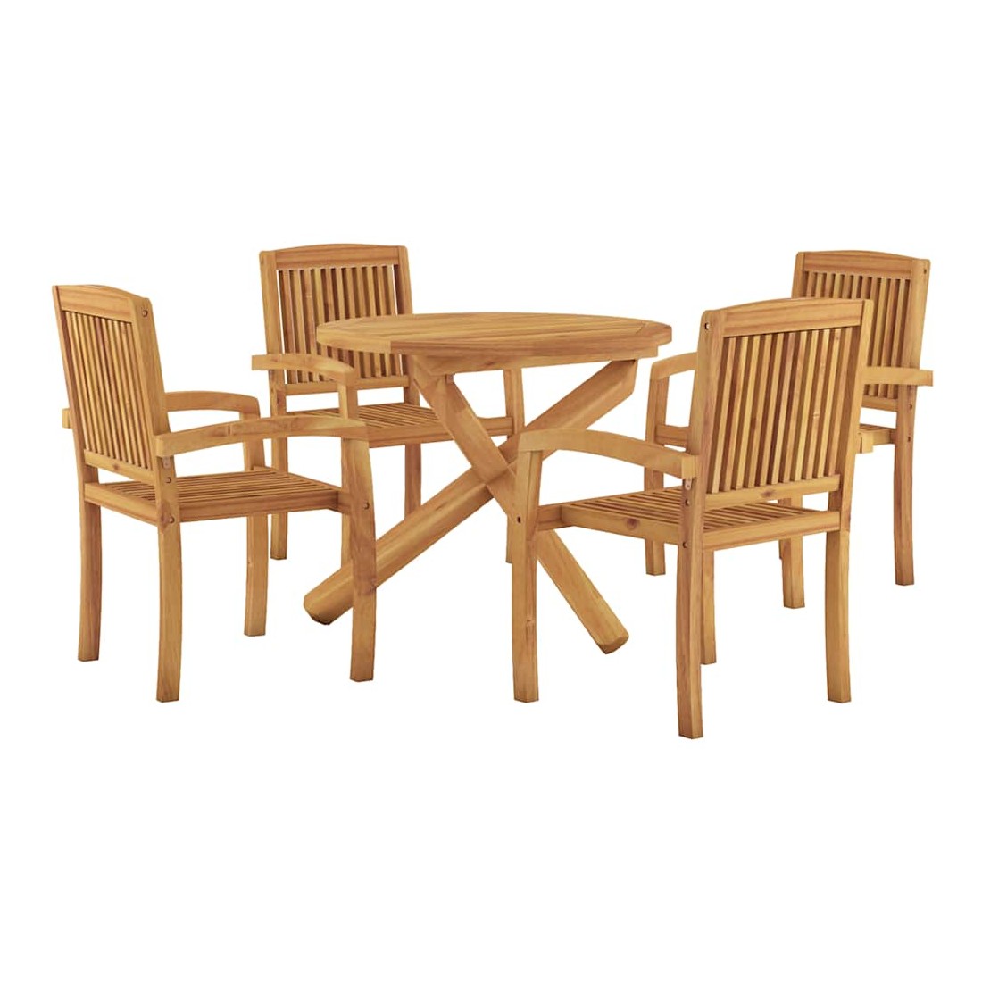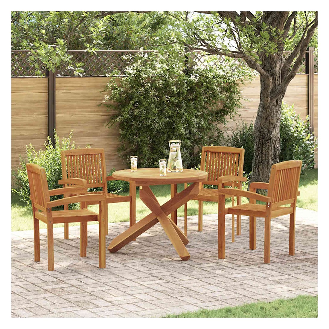 Ajoutez une touche de charme rustique à votre salle à manger, jardin ou terrasse avec cet ensemble de salle à manger ! Bois de teck massif : le bois de teck massif est un matériau naturel magnifique. Il a été chevronné, séché au four, puis sablé finement pour lui donner une apparence très lisse. Le bois de teck est connu pour sa résistance exceptionnelle et sa résistance aux intempéries.Cadre robuste : les cadres en bois assurent robustesse et stabilité, faisant de cet ensemble de salle à manger le choix parfait si vous souhaitez acheter une pièce de meuble de jardin durable.Chaise empilable : les chaises de salle à manger peuvent être empilées pour économiser de l'espace de stockage lorsqu'elles ne sont pas utilisées. Remarque :Afin de prolonger la durée de vie de votre mobilier d'extérieur, nous vous recommandons de le protéger avec une housse imperméable.