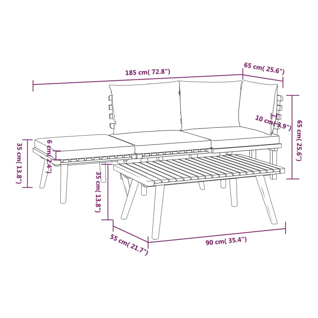 • Dimensions du canapé de milieu : 60 x 65 x 65 cm (l x P x H)
