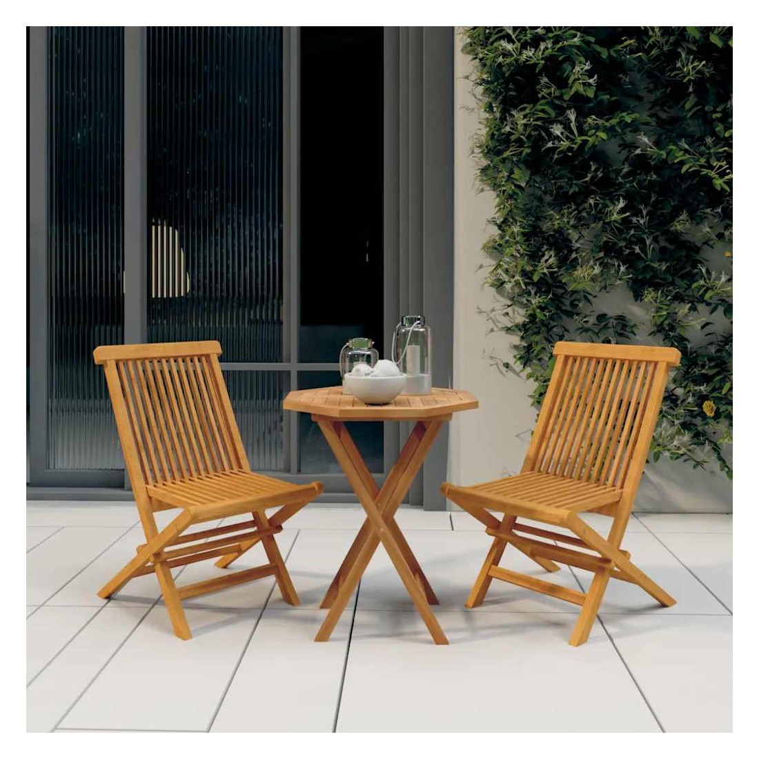 Cet ensemble de salle à manger de jardin en bois, au design élégant, est un excellent choix pour vos repas ou vos moments de détente sur votre patio ou dans votre jardin. Bois de teck massif : le bois de teck massif est un matériau naturel magnifique. Il a été chevronné, séché au four, puis sablé finement pour lui donner une apparence très lisse. Le bois de teck est connu pour sa résistance exceptionnelle et sa résistance aux intempéries.Cadre robuste : le cadre en bois assure robustesse et stabilité.Design pliable : ces chaises et table en bois peuvent être facilement pliées lorsqu'elles ne sont pas utilisées. Remarque :Afin de prolonger la durée de vie de votre mobilier d'extérieur, nous vous recommandons de le protéger avec une housse imperméable.