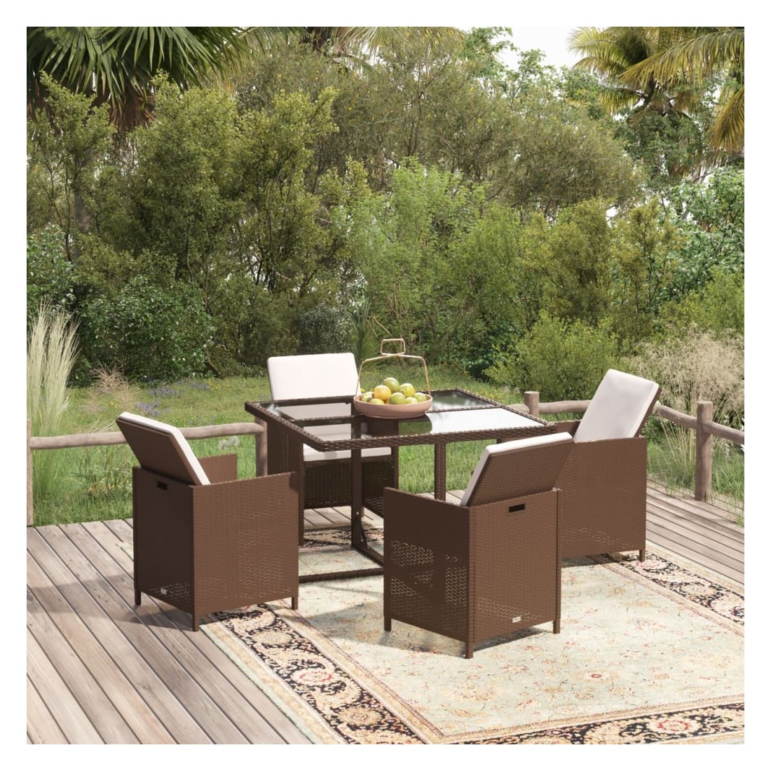 L'ensemble de salle à manger de jardin classique, au design élégant et contemporain, est un excellent choix pour manger et vous détendre dans votre jardin. Convient à un usage extérieur : fabriqué en résine tressée résistante aux intempéries, cet ensemble repas d'extérieur est facile à nettoyer, résistant à l'usure et convient à un usage quotidien. Cadre robuste : le cadre en acier enduit de poudre rend l'ensemble de salle à manger de patio robuste et durable. Expérience confortable : les coussins de siège et de dossier épais, doux et remplis de mousse ajoutent également un confort d'assise supplémentaire. Design flexible : vous pouvez tirer le dossier vers le bas et ranger les chaises sous la table, économisant ainsi un espace de rangement précieux lorsque l'ensemble n'est pas utilisé. Grâce à sa conception légère, tous les articles sont faciles à déplacer. Remarque :Afin de prolonger la durée de vie de votre mobilier d'extérieur, nous vous recommandons de le protéger avec une housse imperméable.
