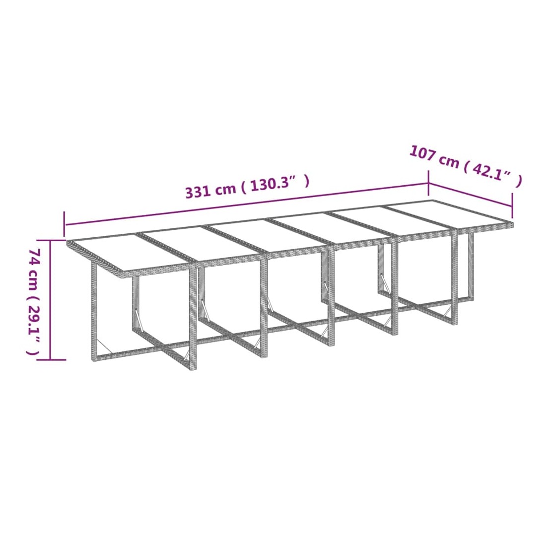 - Dimensions de la table : 331 x 107 x 74 cm (L x l x H)