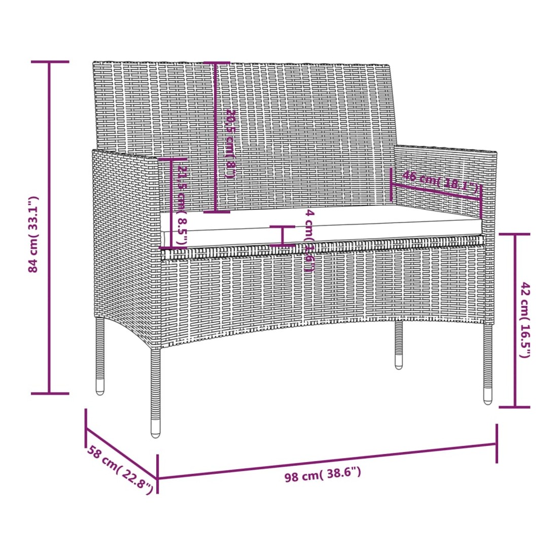 - Dimensions du canapé à 2 places : 98 x 58 x 84 cm (l x P x H)
