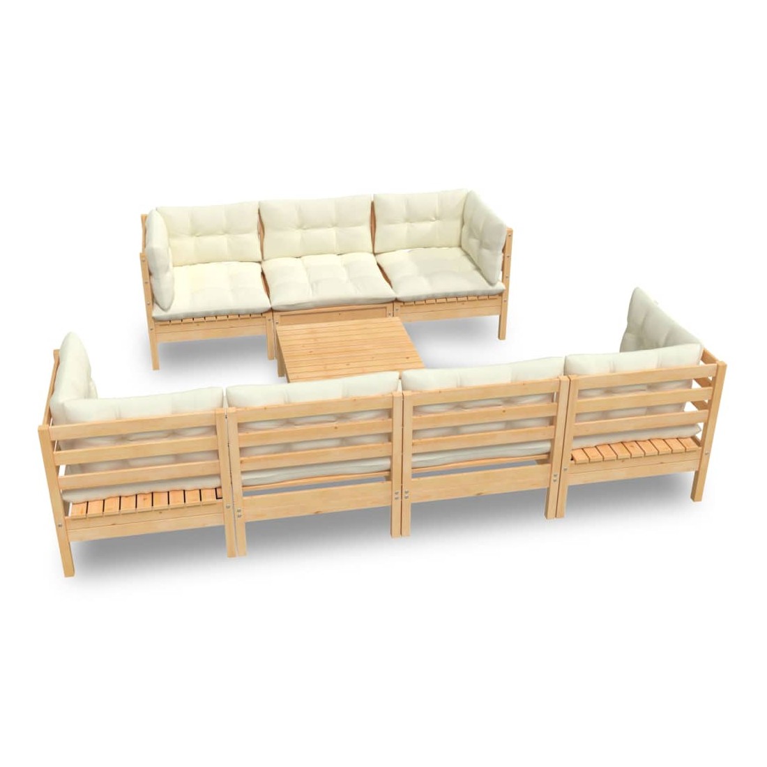Ce salon de jardin est un excellent choix pour vous détendre et profiter du beau temps, faire une sieste ou discuter avec votre famille ou vos amis. Le salon de patio est fabriqué en bois de pin massif, ce qui le rend robuste et stable. Les coussins ajoutent un confort supplémentaire. Vous pouvez le combiner avec d’autres segments modulaires pour créer vos propres configurations de salon de jardin ! Remarque : afin de prolonger la durée de vie des meubles d'extérieur, nous vous recommandons de les protéger avec une housse imperméable.