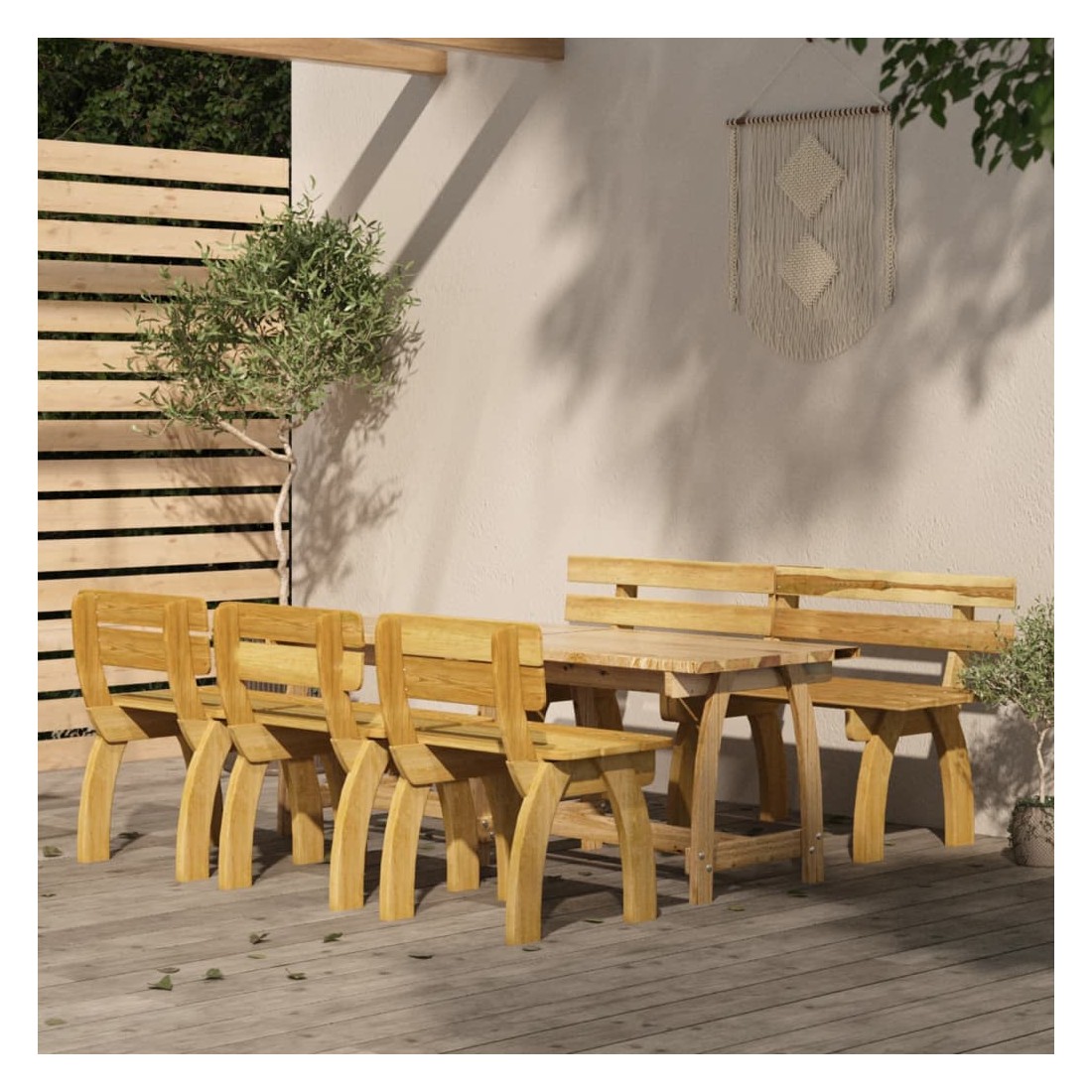 Avec un design élégant mais pratique, cet ensemble de salle à manger de jardin sublime votre espace de vie extérieur ! Fabriqué en bois de pin imprégné de vert, cet ensemble de salle à manger de jardin en bois est très solide, durable et résistant à la corrosion. Cet ensemble de meubles est un choix idéal pour les moments de détente dans un jardin de maison de campagne romantique ou près d'un étang de jardin idyllique pour dîner en famille et entre amis. Veuillez noter que le bois est un produit naturel et peut présenter des imperfections. Remarque : afin de prolonger la durée de vie des meubles d'extérieur, nous vous recommandons de les protéger avec une housse imperméable.