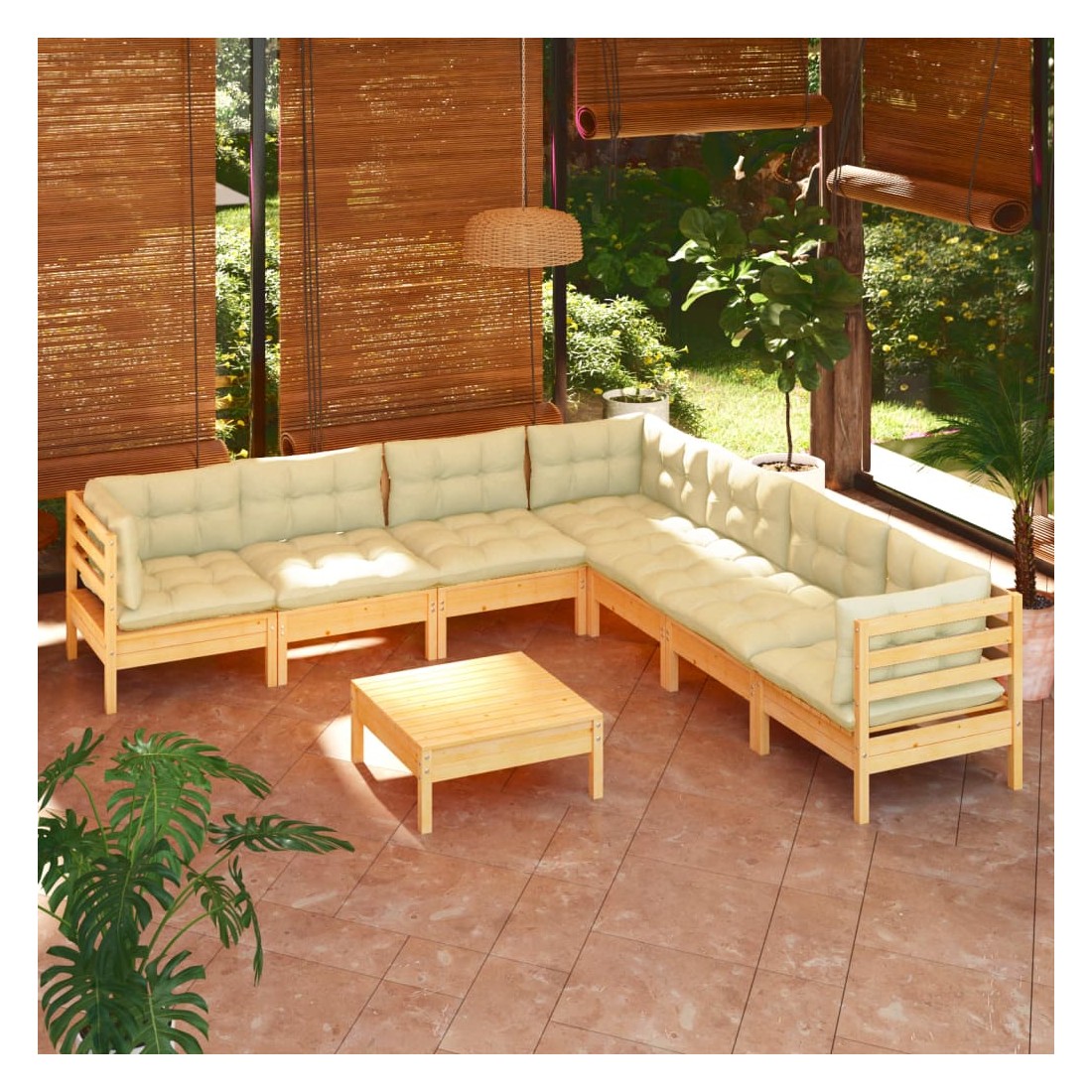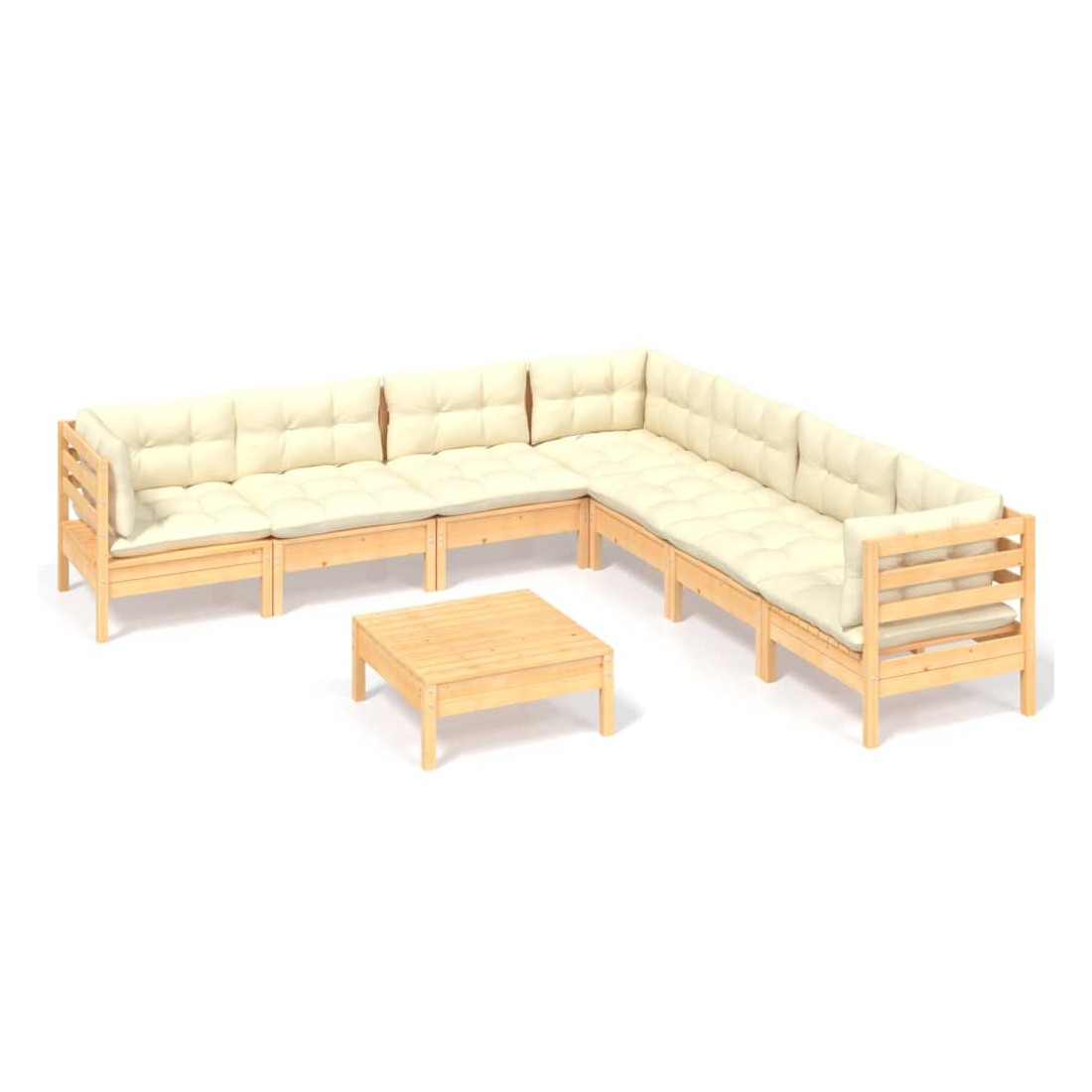 Salon de jardin 8 pcs avec coussins crème Bois de pin massif