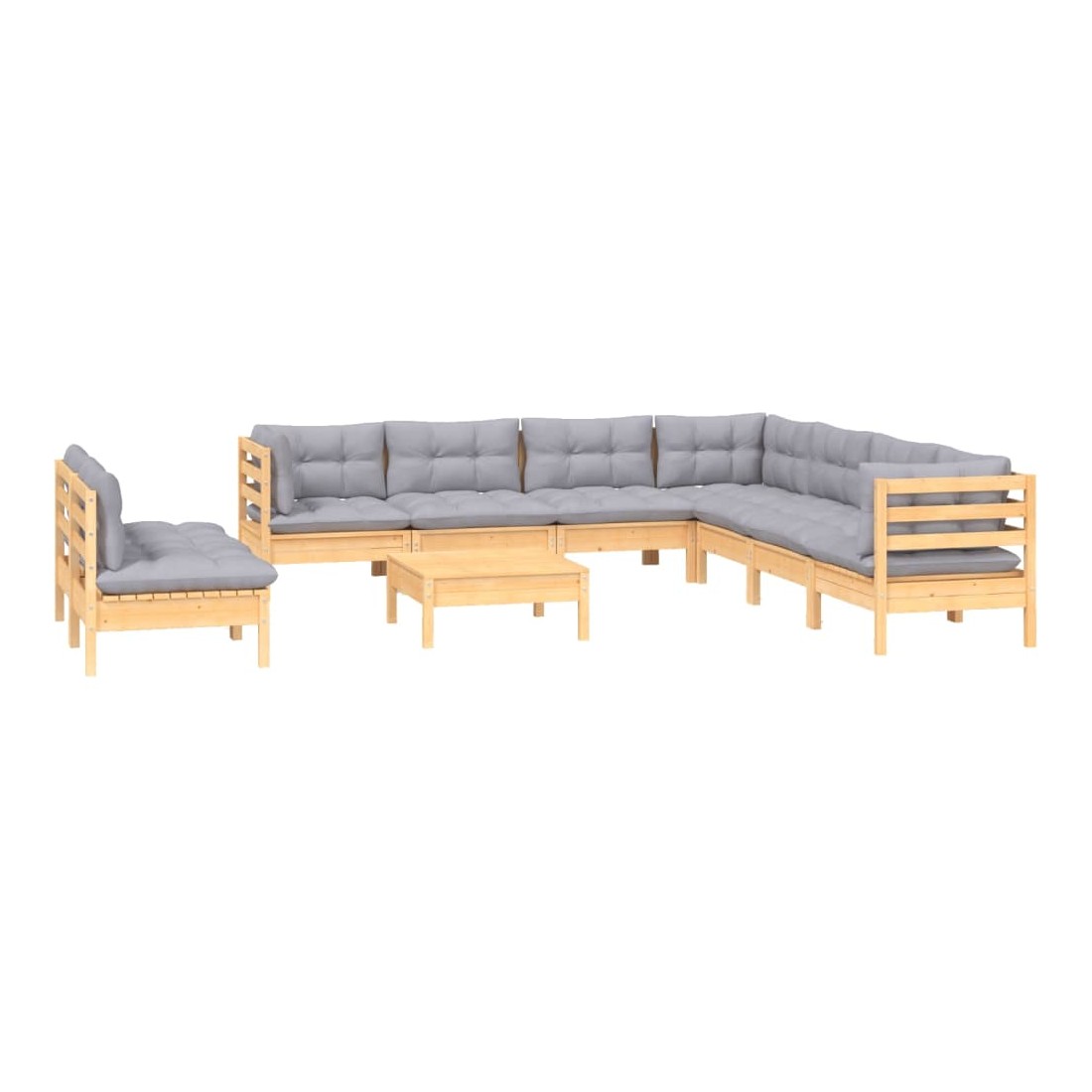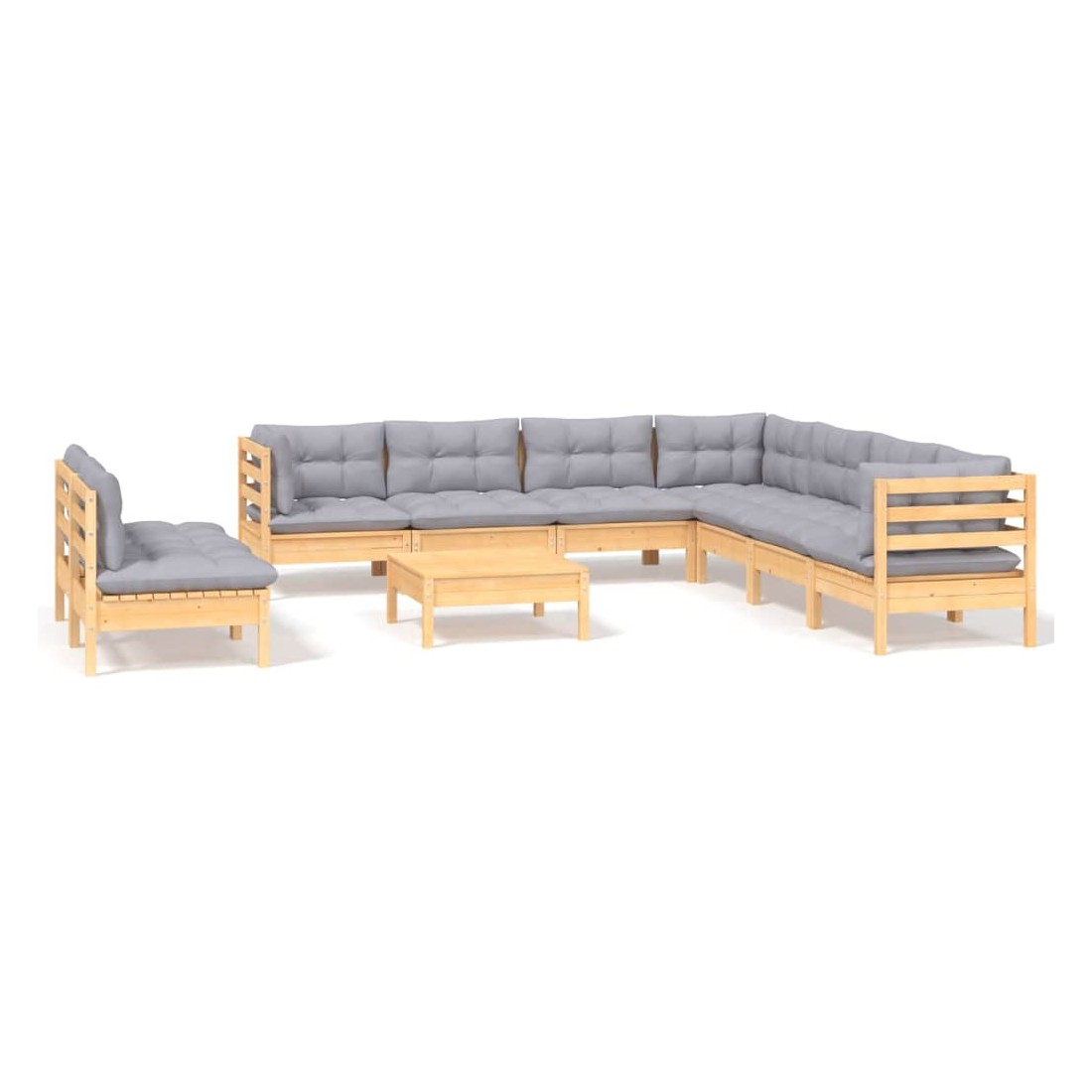 Salon de jardin 10 pcs avec coussins gris bois de pin massif