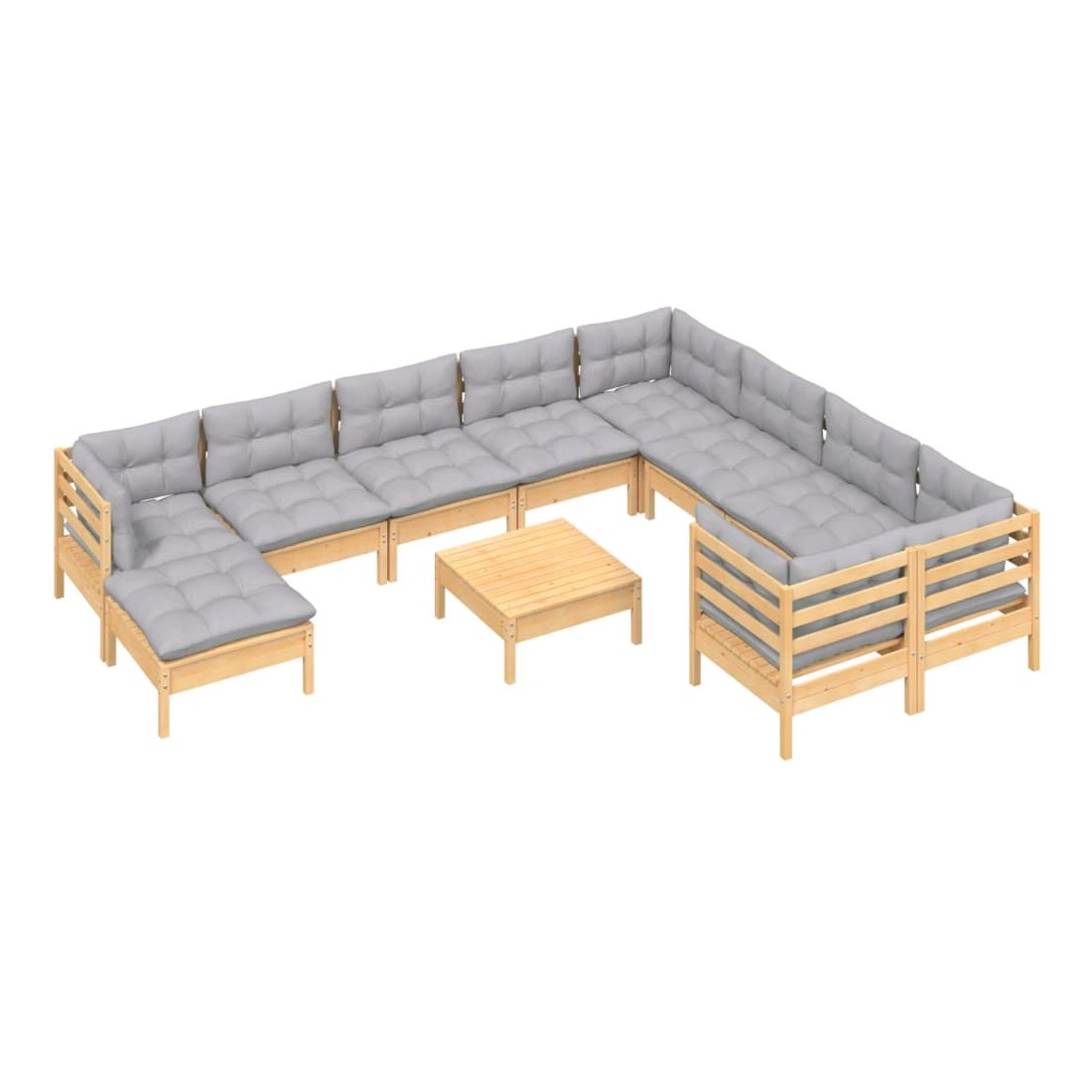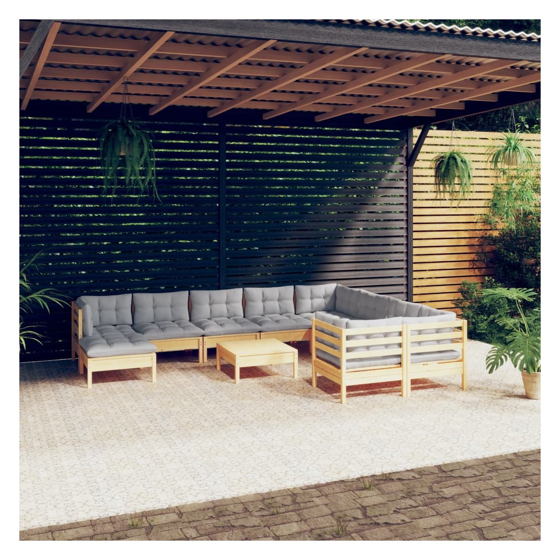 Salon de jardin 11 pcs avec coussins gris bois de pin