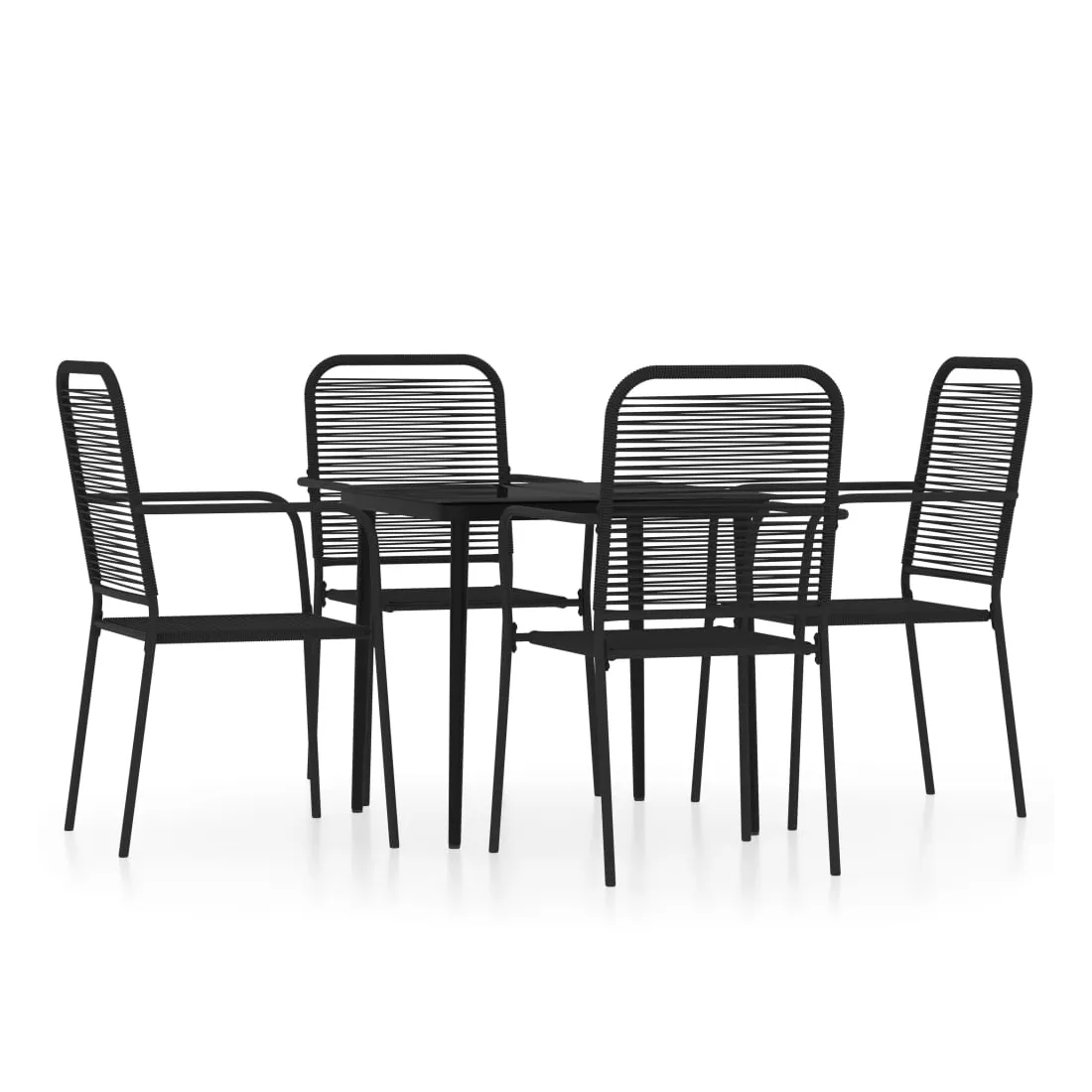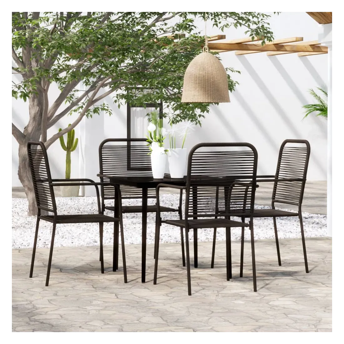 Cet ensemble de meubles de salle à manger tendance au design élégant et aux lignes épurées est un excellent choix pour votre jardin, patio, terrasse, cuisine et même salle à manger. L'élégance simpliste de cet ensemble de salle à manger rend votre dîner quotidien spécial. Cet ensemble de salle à manger de jardin dispose d’un cadre en acier enduit de poudre qui rend la table et les chaises stables et durables. Le dossier et le siège sont fabriqués en corde de coton torsadée, qui est douce au toucher et robuste pour une utilisation à long terme. De plus, la table est dotée d'un dessus en verre trempé, facile à nettoyer avec un chiffon humide et parfait pour placer des repas, des boissons et d'autres objets décoratifs. Remarque : afin de prolonger la durée de vie des meubles d'extérieur, nous vous recommandons de les protéger avec une housse imperméable.