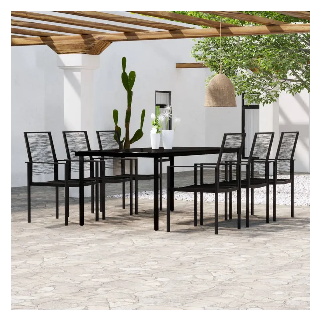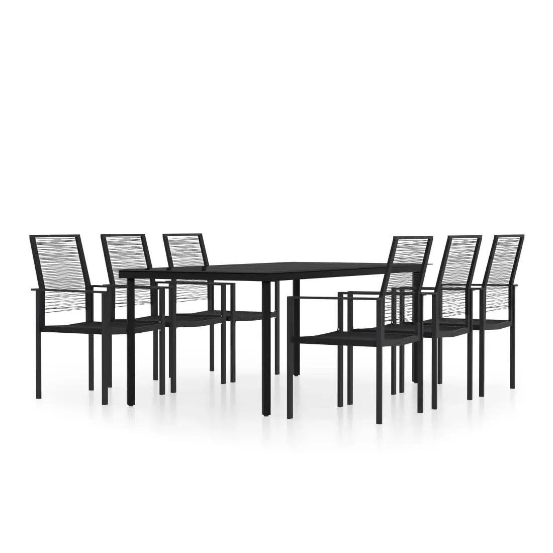 Créez une esthétique convaincante et uniforme dans votre espace extérieur avec cet ensemble de salle à manger de jardin ! L'ensemble de salle à manger de patio est doté d'un cadre en acier enduit de poudre qui rend la table et les chaises stables et durables. Le dessus de table en verre lisse est facile à nettoyer à l'aide d'un chiffon humide et est parfait pour placer des repas, des boissons et d'autres objets décoratifs. Grâce au rotin creux PVC résistant à l’eau, les chaises sont résistantes à l'usure, faciles à entretenir et adaptées à une utilisation quotidienne à l’extérieur. De plus, les dossiers ajoutent un confort supplémentaire aux chaises. Remarque : afin de prolonger la durée de vie des meubles d'extérieur, nous vous recommandons de les protéger avec une housse imperméable.