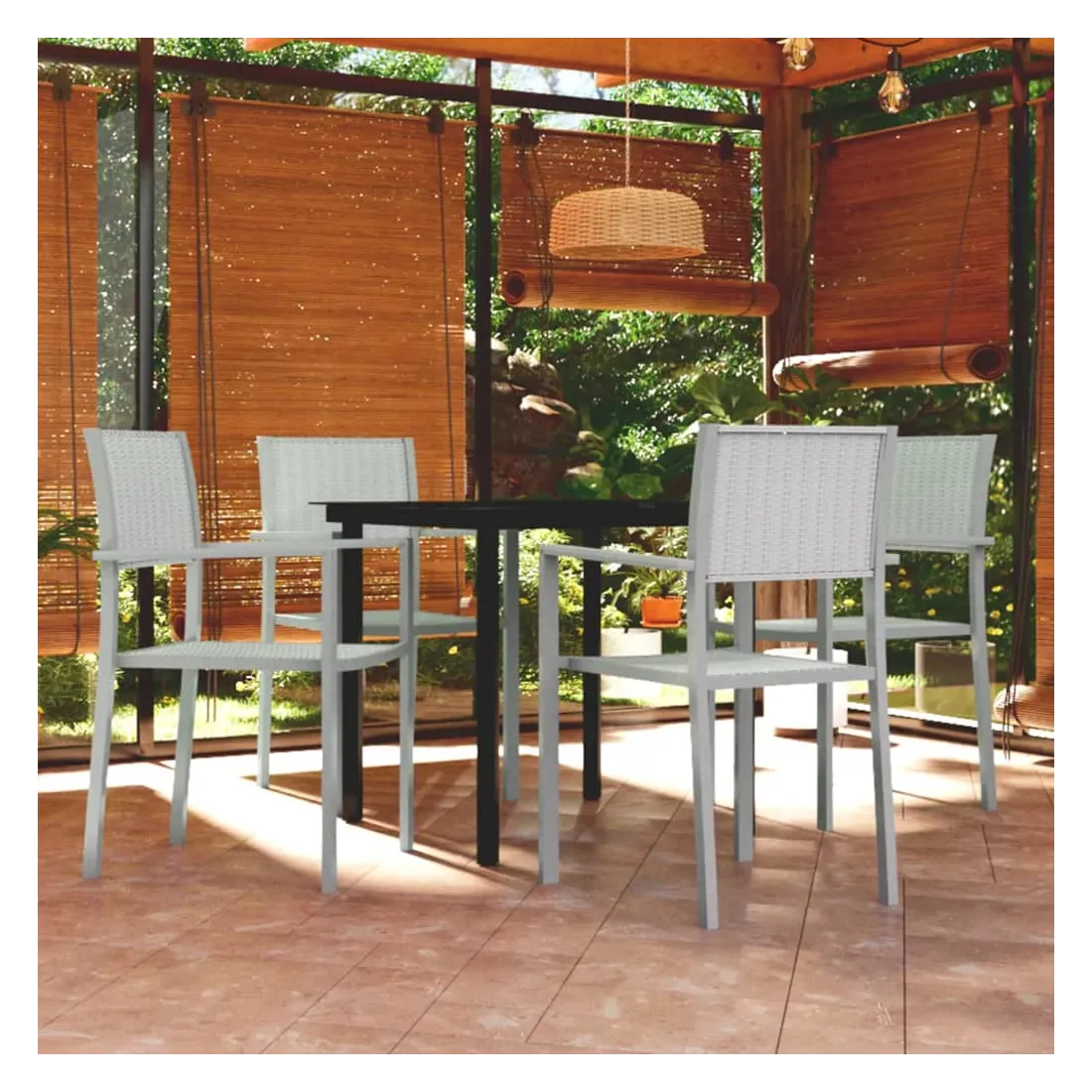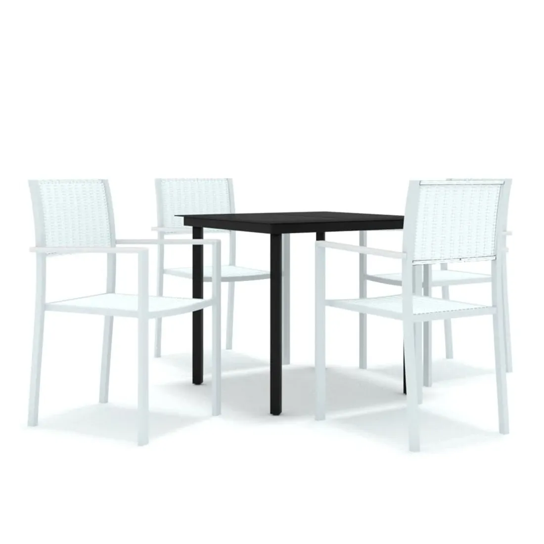Cet ensemble de salle à manger de jardin est une combinaison parfaite de style et de fonctionnalité et est destiné à être le point de mire de votre jardin, balcon ou patio. Cet ensemble de meubles de patio est fabriqué à partir d'un cadre en acier enduit de poudre, ce qui le rend robuste et stable pour une utilisation quotidienne à l’extérieur. Le dessus de table en verre lisse est facile à nettoyer avec un chiffon humide et parfait pour placer les repas, les boissons et autres articles décoratifs. Les chaises à dîner d'extérieur légères sont fabriquées en plastique, ce qui les rend faciles à nettoyer et à déplacer. Les chaises de salle à manger de jardin, avec leur design d'aspect de rotin, ajoutent une touche de charme naturel à votre espace de vie extérieur ! Remarque : afin de prolonger la durée de vie des meubles d'extérieur, nous vous recommandons de les protéger avec une housse imperméable.