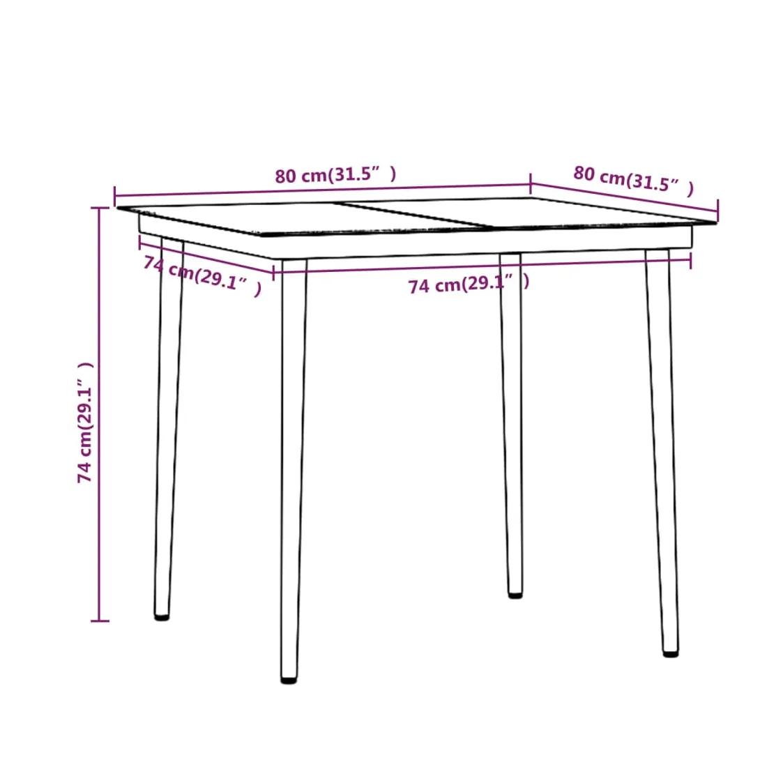 • Dimensions de la table : 80 x 80 x 74 cm (L x I x H)