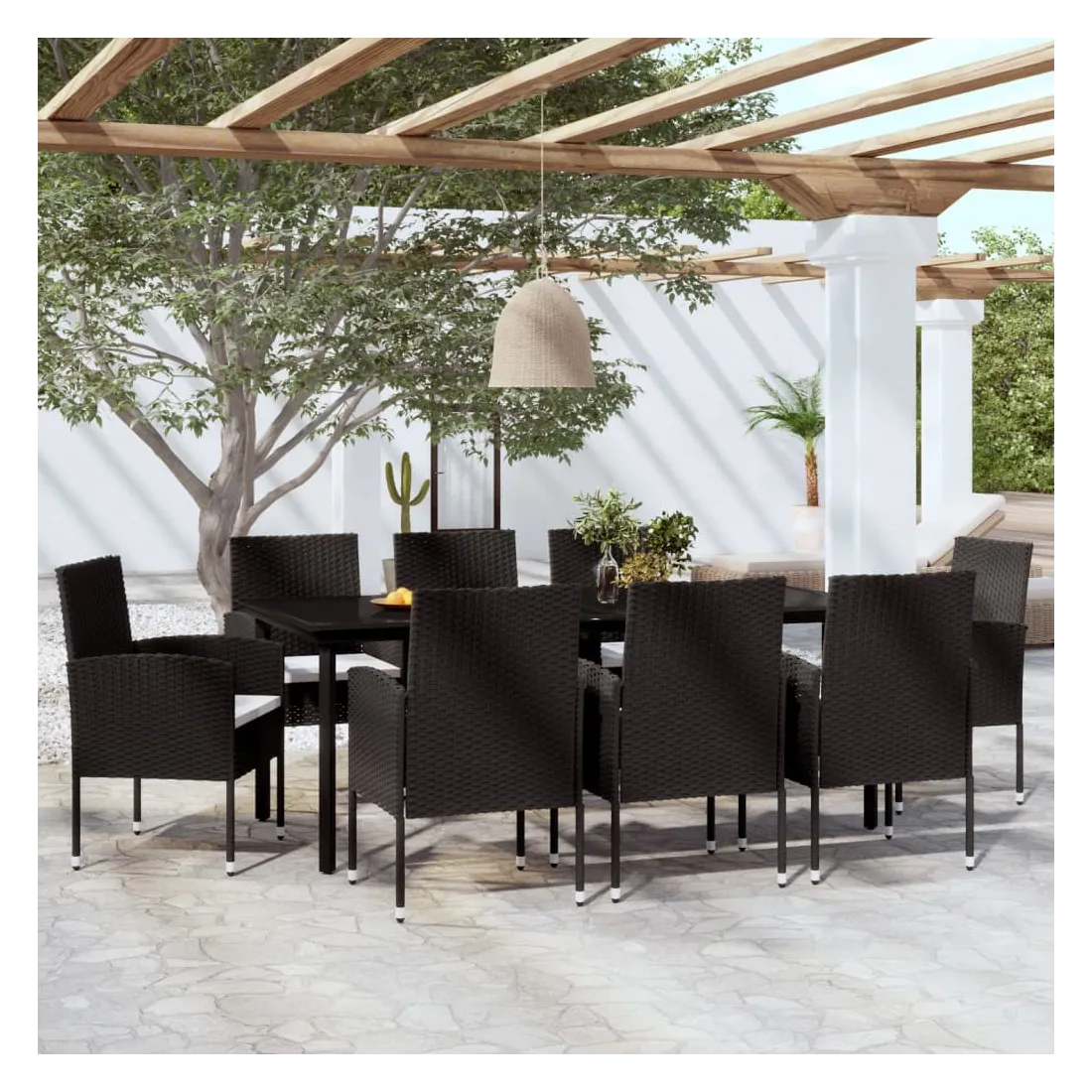 Profitez d'un bon repas ou d'un thé l'après-midi dans votre espace extérieur avec cet ensemble de salle à manger de jardin ! Ayant un design élégant, il deviendra le point central de votre jardin et de votre terrasse ! Cet ensemble de salle à manger d'extérieur pratique est doté d'un cadre en acier, ce qui le rend solide et robuste. Les chaises de jardin sont fabriquées en résine tressée résistante à l'eau et sans entretien, ce qui les rend parfaites pour une utilisation à l'extérieur. Le dessus de table en verre lisse est facile à nettoyer à l'aide d'un chiffon humide et est excellent pour placer des repas, des boissons et d'autres objets décoratifs. En outre, les coussins d'assise épais et amovibles sont très confortables. Remarque : afin de prolonger la durée de vie des meubles d'extérieur, nous vous recommandons de les protéger avec une housse imperméable.