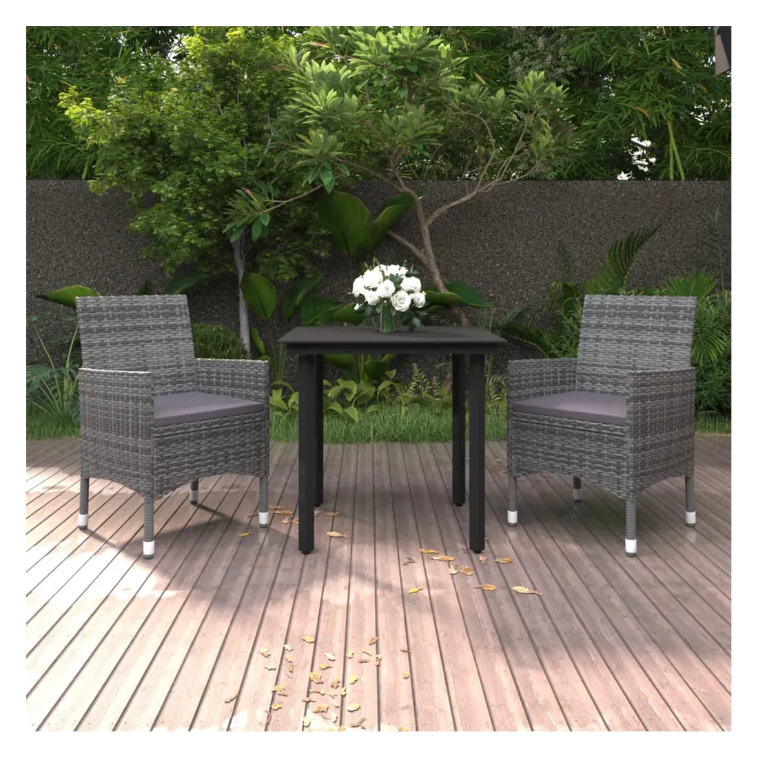 Cet ensemble élégant de salle à manger de jardin vous permet de passer des moments agréables et confortables avec votre famille et vos amis. Le cadre en acier enduit de poudre rend la table et les chaises robustes et durables. Fabriquées en résine tressée résistante aux intempéries et imperméable, les chaises sont faciles à nettoyer, résistantes à l'usure et adaptées à un usage quotidien. Le dessus de table en verre lisse est idéal pour poser des boissons, de la nourriture ou des objets décoratifs. De plus, le coussin de siège bien rembourré ajoute un confort supplémentaire aux chaises. Remarque : afin de prolonger la durée de vie des meubles d'extérieur, nous vous recommandons de les protéger avec une housse imperméable.
