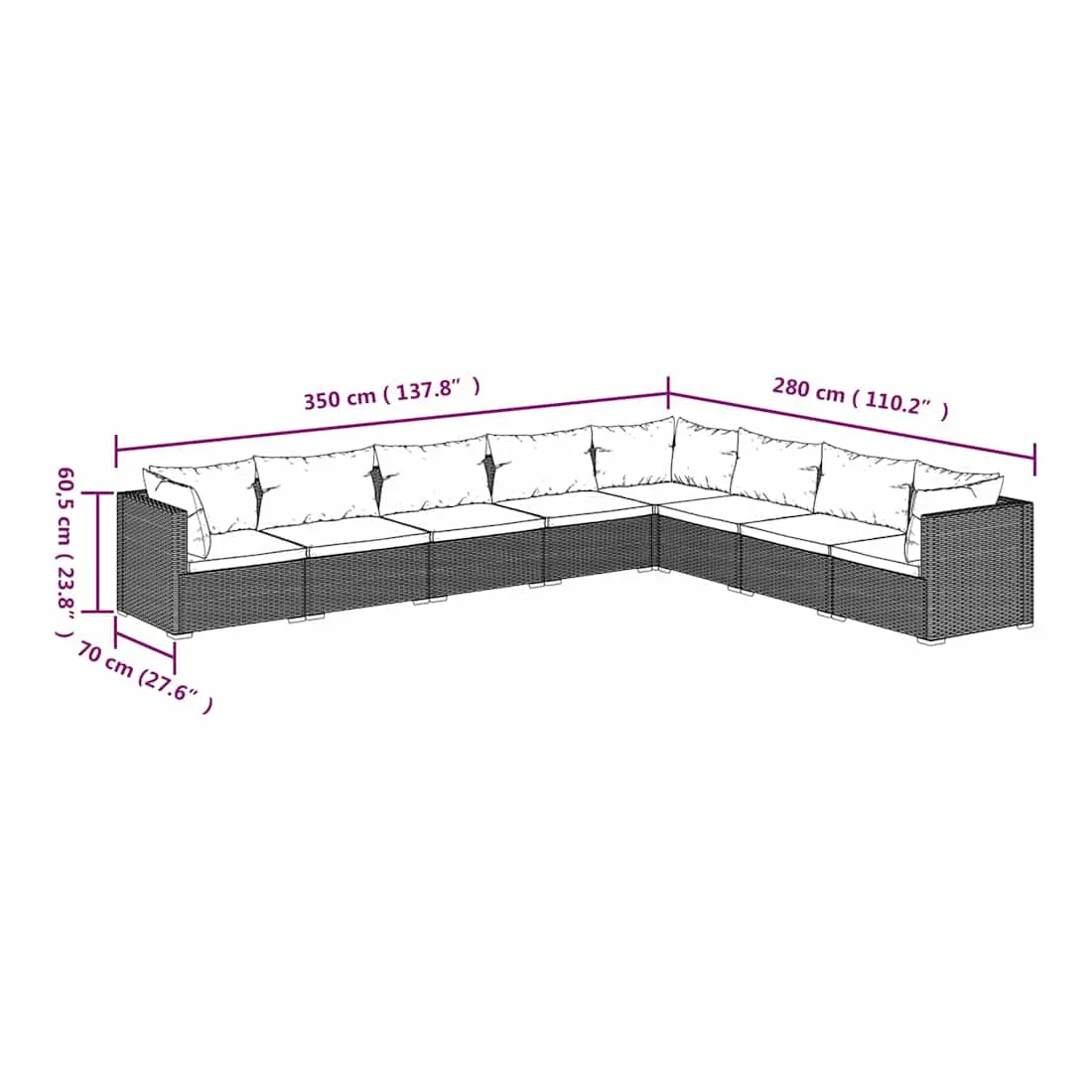 • Dimensions du canapé d'angle/central (chacun) : 70 x 70 x 60,5 cm (L x l x H)
