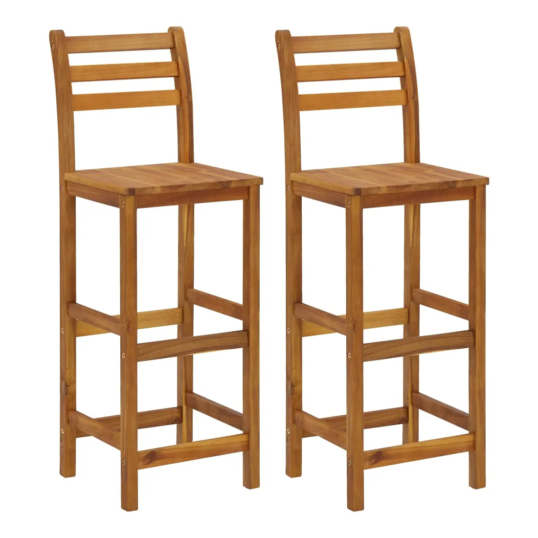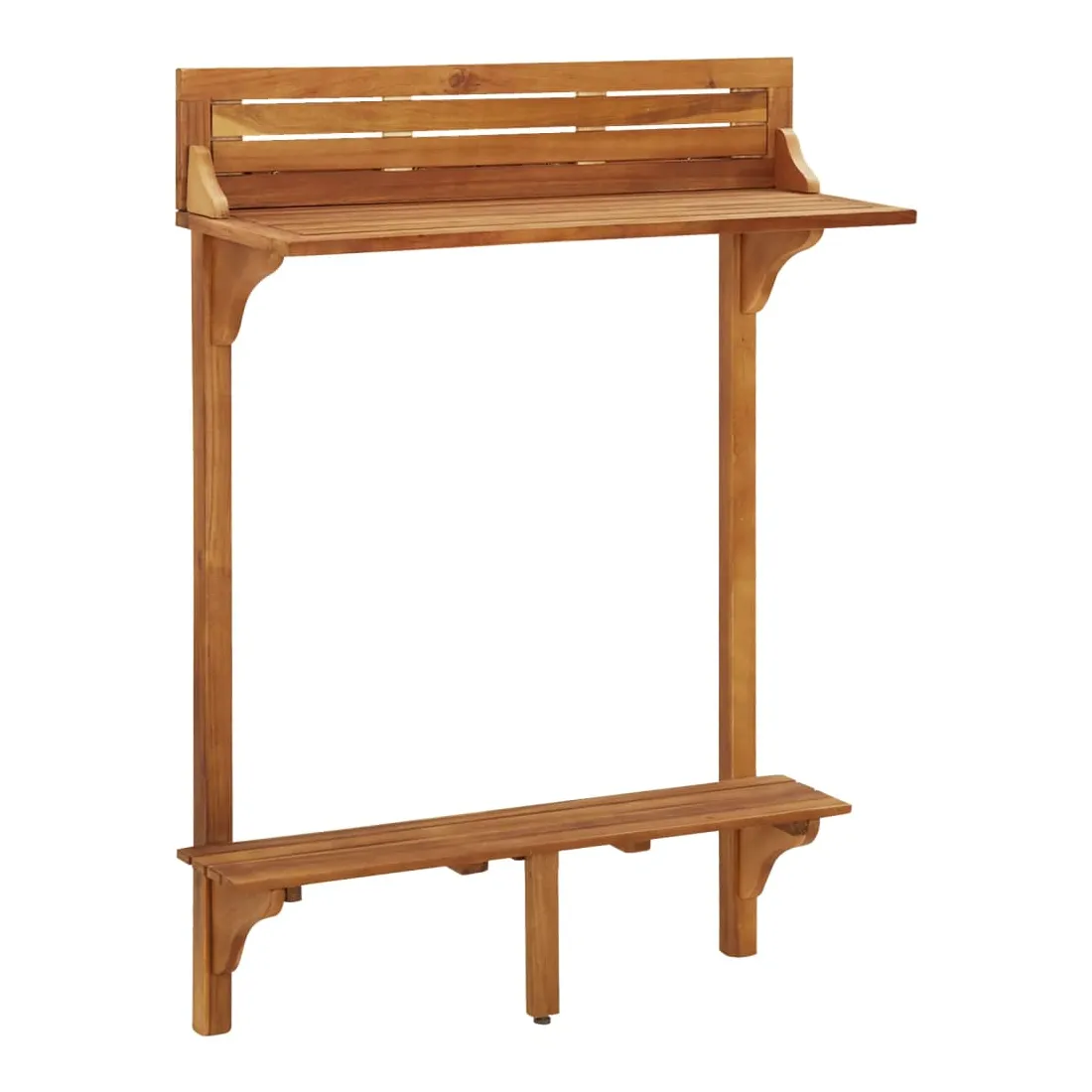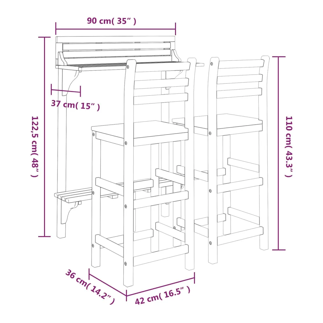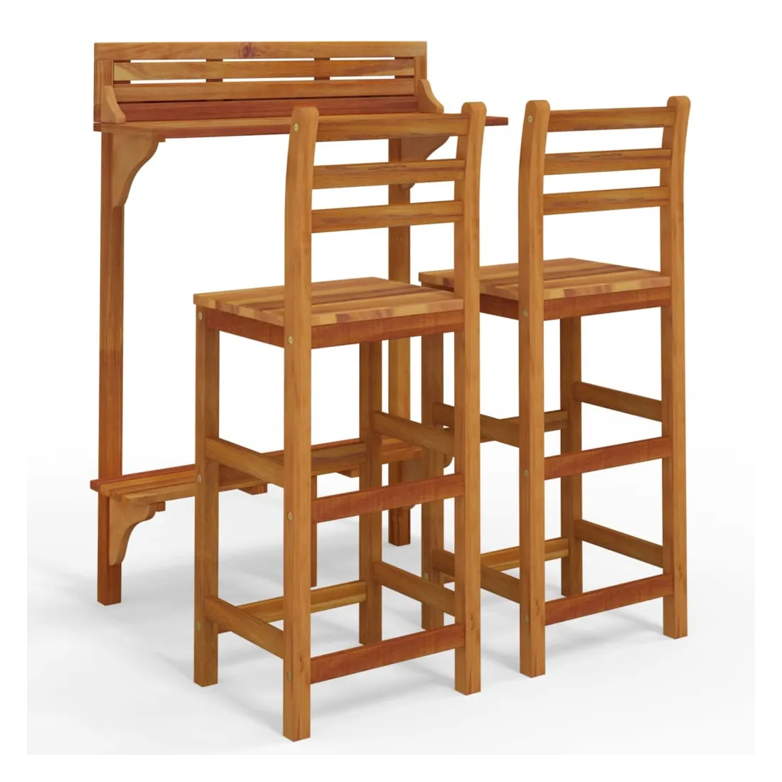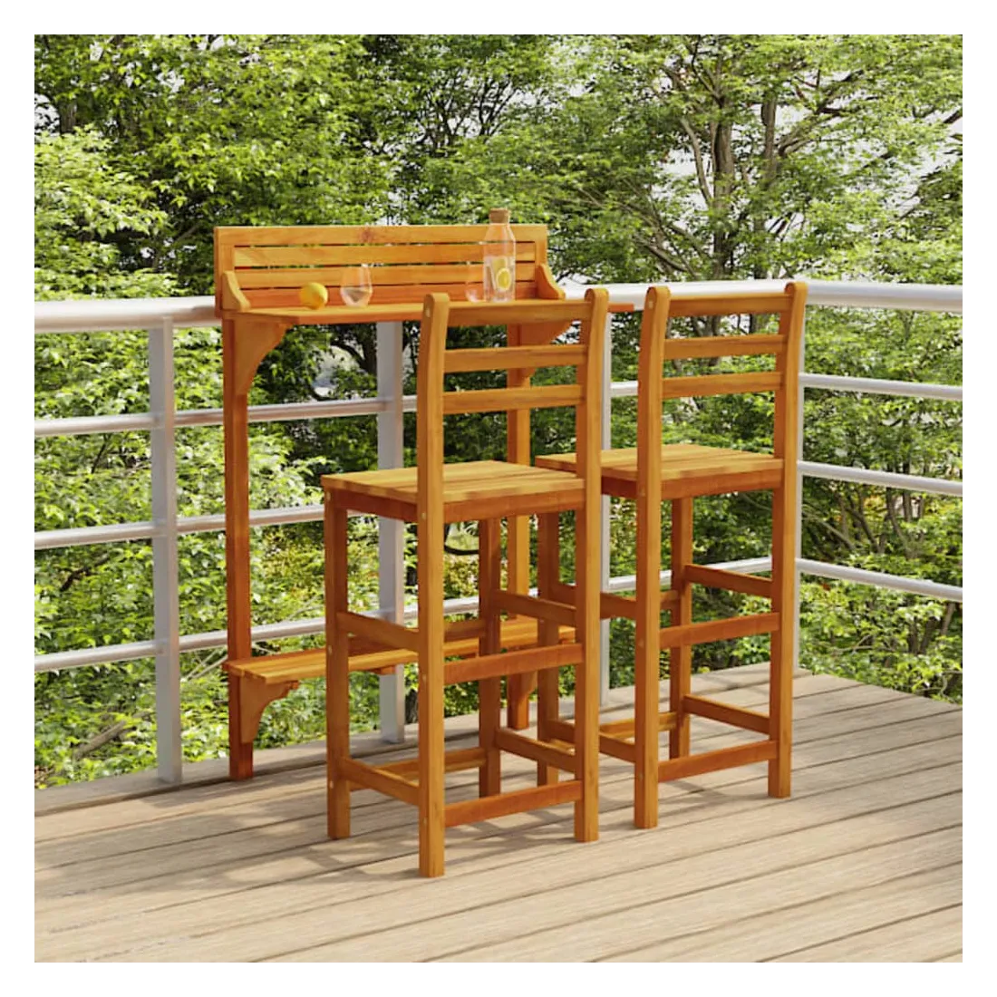 Cet ensemble de bar de balcon en bois a un design élégant et est destiné à être le point central de votre jardin, patio ou terrasse. Bois d'acacia massif : le bois d'acacia massif est un magnifique matériau naturel. Le bois d'acacia est un bois dur tropical, dense, robuste et durable. De plus, la surface à finition à l'huile facilite le nettoyage de la table et des chaises de jardin.Cadre en bois robuste : les cadres en bois de l'ensemble de bar d'extérieur garantissent la solidité et la stabilité.Dessus de table pratique : grâce au dessus de table en bois massif, cette table de bistrot peut également être utilisée comme support pour plantes pour exposer vos plantes en pot, herbes, fleurs ou autres décorations extérieures, en particulier sur les petits balcons ou patios.Tabourets de bar confortables : les repose-pieds de ces tabourets de bar en bois offrent un confort d'assise supplémentaire.Supports métalliques : les supports métalliques inclus peuvent être utilisés pour fixer la table de pub aux rails du balcon. Remarque :Afin de prolonger la durée de vie de votre mobilier d'extérieur, nous vous recommandons de le protéger avec une housse imperméable.