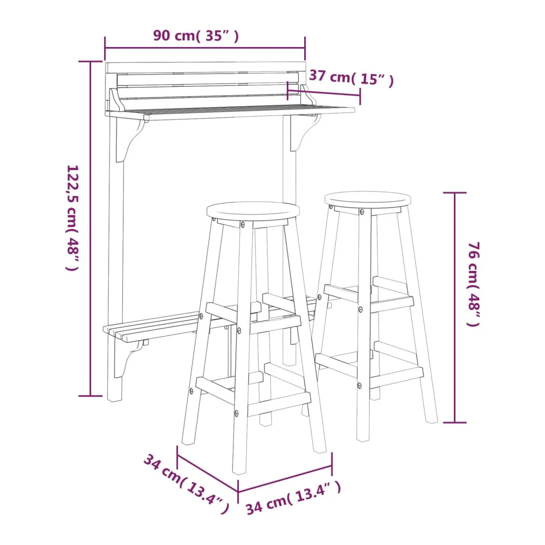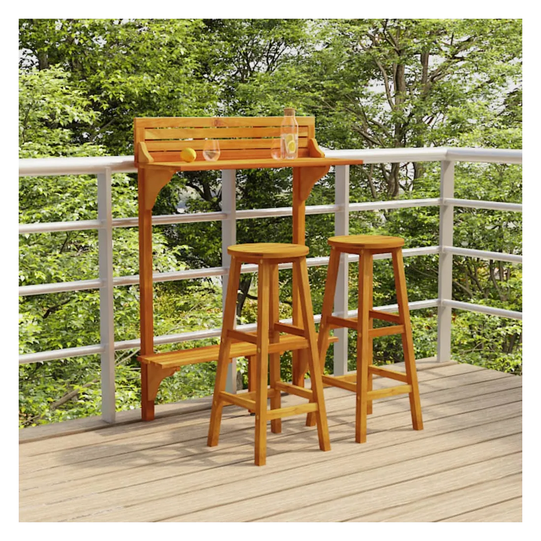 Cet ensemble de bar de balcon en bois a un design élégant et est destiné à être le point central de votre jardin, patio ou terrasse. Bois d'acacia massif : le bois d'acacia massif est un magnifique matériau naturel. Le bois d'acacia est un bois dur tropical, dense, robuste et durable. De plus, la surface à finition à l'huile facilite le nettoyage de la table et des chaises de jardin.Cadre en bois robuste : les cadres en bois de l'ensemble de salle à manger d'extérieur garantissent la solidité et la stabilité.Dessus de table pratique : grâce au dessus de table en bois massif, cette table de bistrot peut également être utilisée comme support pour plantes pour exposer vos plantes en pot, herbes, fleurs ou autres décorations extérieures, en particulier sur les petits balcons ou patios.Tabourets de bar confortables : les repose-pieds de ces tabourets de bar en bois offrent un confort d'assise supplémentaire.Supports métalliques : les supports métalliques inclus peuvent être utilisés pour fixer la table de pub aux rails du balcon. Remarque :Afin de prolonger la durée de vie de votre mobilier d'extérieur, nous vous recommandons de le protéger avec une housse imperméable.