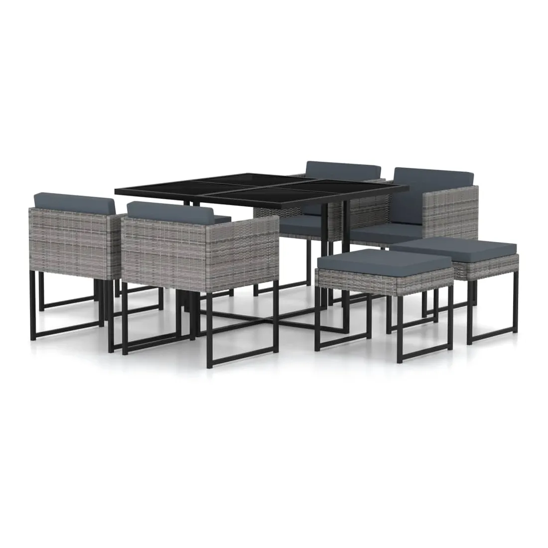 Cet ensemble à manger de jardin tendance pour 8 personnes, au design élégant et moderne, est destiné à être le point de mire de votre jardin ou terrasse ! L'ensemble de salle à manger, en résine tressée résistante aux intempéries et en verre trempé, est facile à nettoyer avec un chiffon humide. Les cadres en acier ajoutent à la robustesse. Grâce à sa construction légère, l'ensemble est facile à déplacer. Les coussins épais et moelleux rembourrés de fibre de coton sont très confortables. Les housses, équipées de fermeture éclair, sont facilement amovibles et lavables. De plus, les tabourets peuvent être placés proprement sous la table lorsqu'ils ne sont pas utilisés pour économiser de l'espace. Remarque : nous vous recommandons de couvrir l'ensemble pendant la pluie, la neige et le gel pour prolonger sa durée de vie de service.