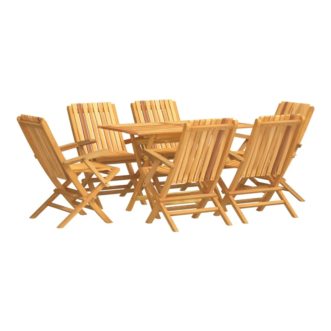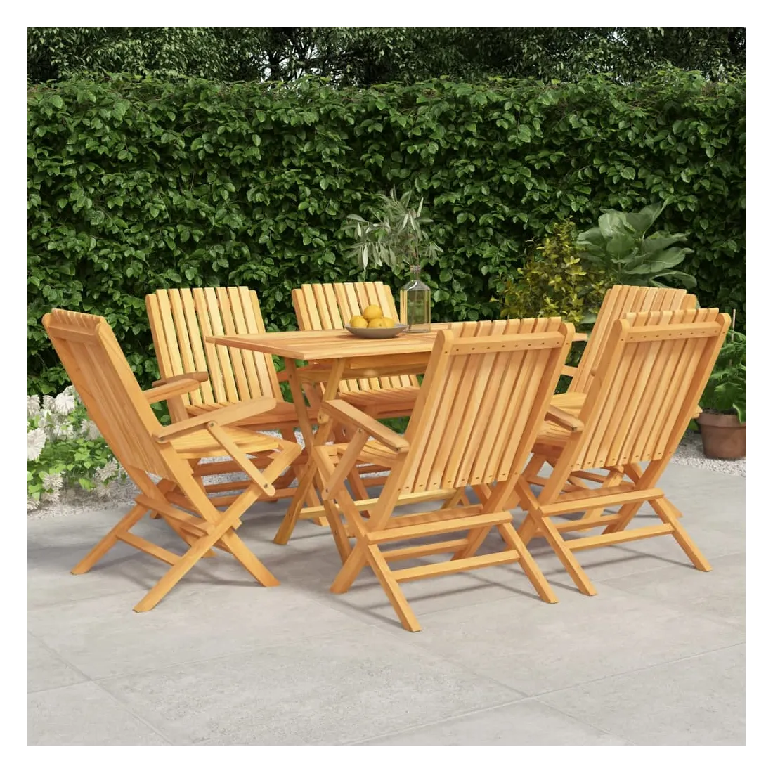 Détendez-vous et profitez d'un thé et de repas agréables avec votre famille et vos amis grâce à cet ensemble de salle à manger de jardin en bois classique ! Bois de teck massif : l'ensemble de salle à manger est fabriqué en bois de teck massif. Le bois de teck massif est un matériau naturel magnifique. Il a été chevronné, séché au four, puis sablé finement pour lui donner une apparence très lisse. Le bois de teck est connu pour sa résistance exceptionnelle et sa résistance aux intempéries.Fonction pliable : l'ensemble de salle à manger d'extérieur peut être plié pour économiser de l'espace lorsqu'il n'est pas utilisé.Expérience confortable : le dossier de la chaise de jardin vous offre un excellent soutien, offrant une expérience confortable optimale.Dessus de table robuste : le dessus de table robuste de la table à manger est parfait pour placer des repas, des boissons, des vases, des bols de fruits ou d'autres objets décoratifs.Trou pour parasol : le dessus de table est doté d'un trou pour parasol, ce qui vous permet de fixer facilement un parasol pour créer un coin ombragé.Design à lattes : la chaise à manger d'extérieur conçue avec un design à lattes est simple et intemporelle. Remarque :Pour que vos meubles d'extérieur restent beaux, nous vous recommandons de les protéger avec une housse imperméable.