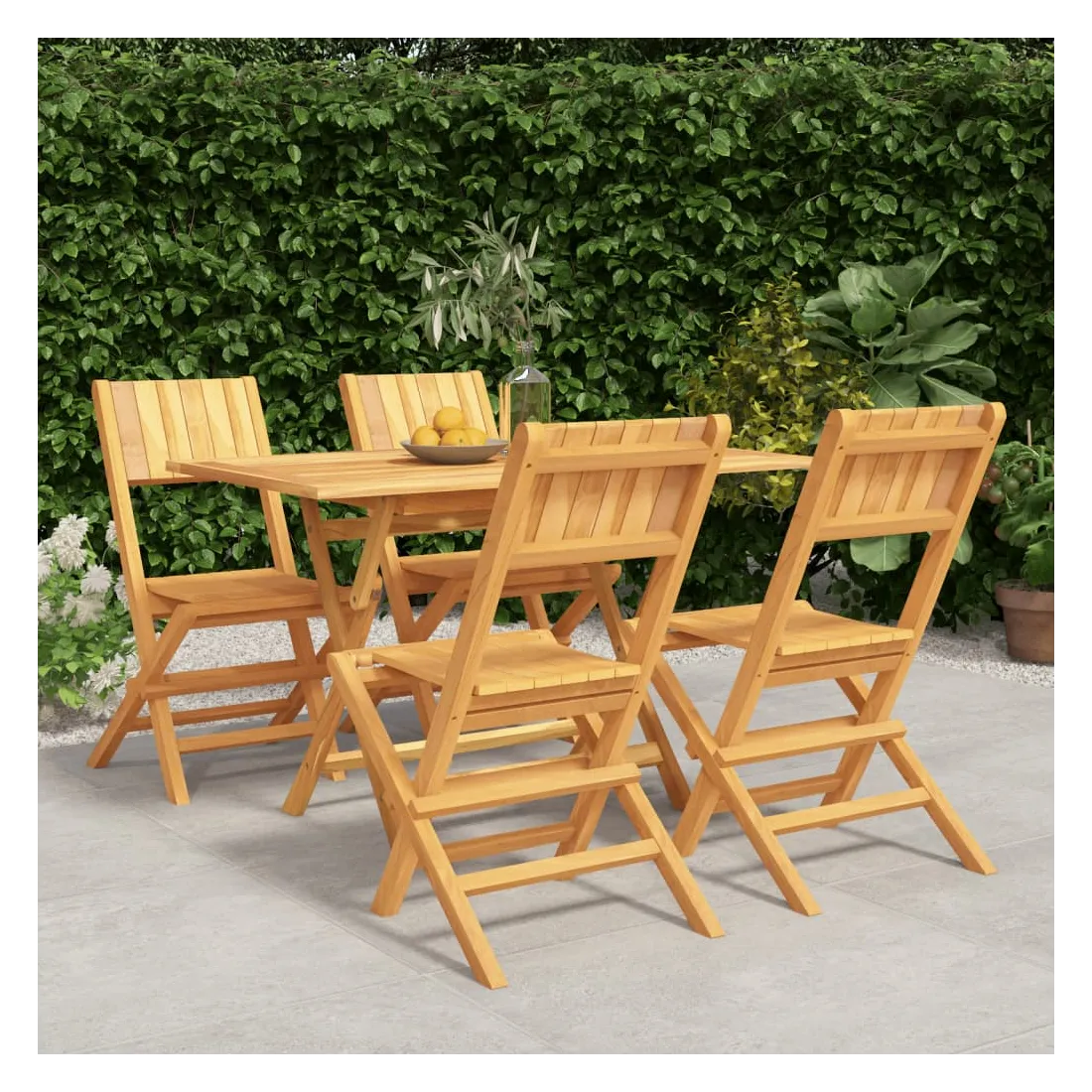 Détendez-vous et profitez d'un thé et de repas agréables avec votre famille et vos amis grâce à cet ensemble de salle à manger de jardin en bois classique ! Bois de teck massif : l'ensemble de salle à manger est fabriqué en bois de teck massif. Le bois de teck massif est un matériau naturel magnifique. Il a été chevronné, séché au four, puis sablé finement pour lui donner une apparence très lisse. Le bois de teck est connu pour sa résistance exceptionnelle et sa résistance aux intempéries.Fonction pliable : l'ensemble de salle à manger d'extérieur peut être plié pour économiser de l'espace lorsqu'il n'est pas utilisé.Expérience confortable : le dossier de la chaise de jardin vous offre un excellent soutien, offrant une expérience confortable optimale.Dessus de table robuste : le dessus de table robuste de la table à manger est parfait pour placer des repas, des boissons, des vases, des bols de fruits ou d'autres objets décoratifs.Trou pour parasol : le dessus de table est doté d'un trou pour parasol, ce qui vous permet de fixer facilement un parasol pour créer un coin ombragé.Design à lattes : la chaise à manger d'extérieur conçue avec un design à lattes est simple et intemporelle. Remarque :Pour que vos meubles d'extérieur restent beaux, nous vous recommandons de les protéger avec une housse imperméable.
