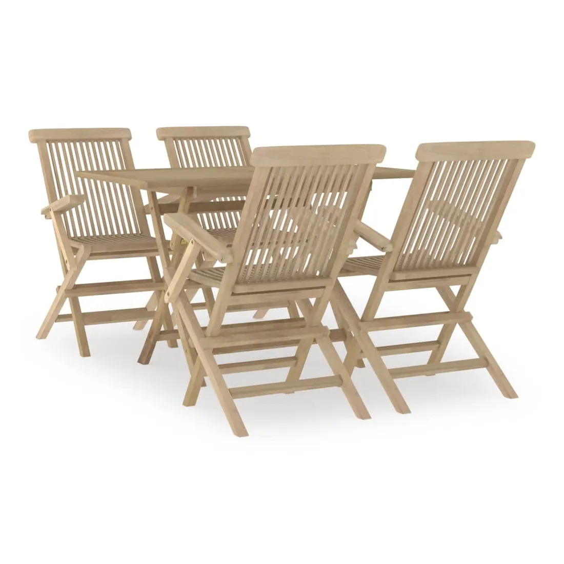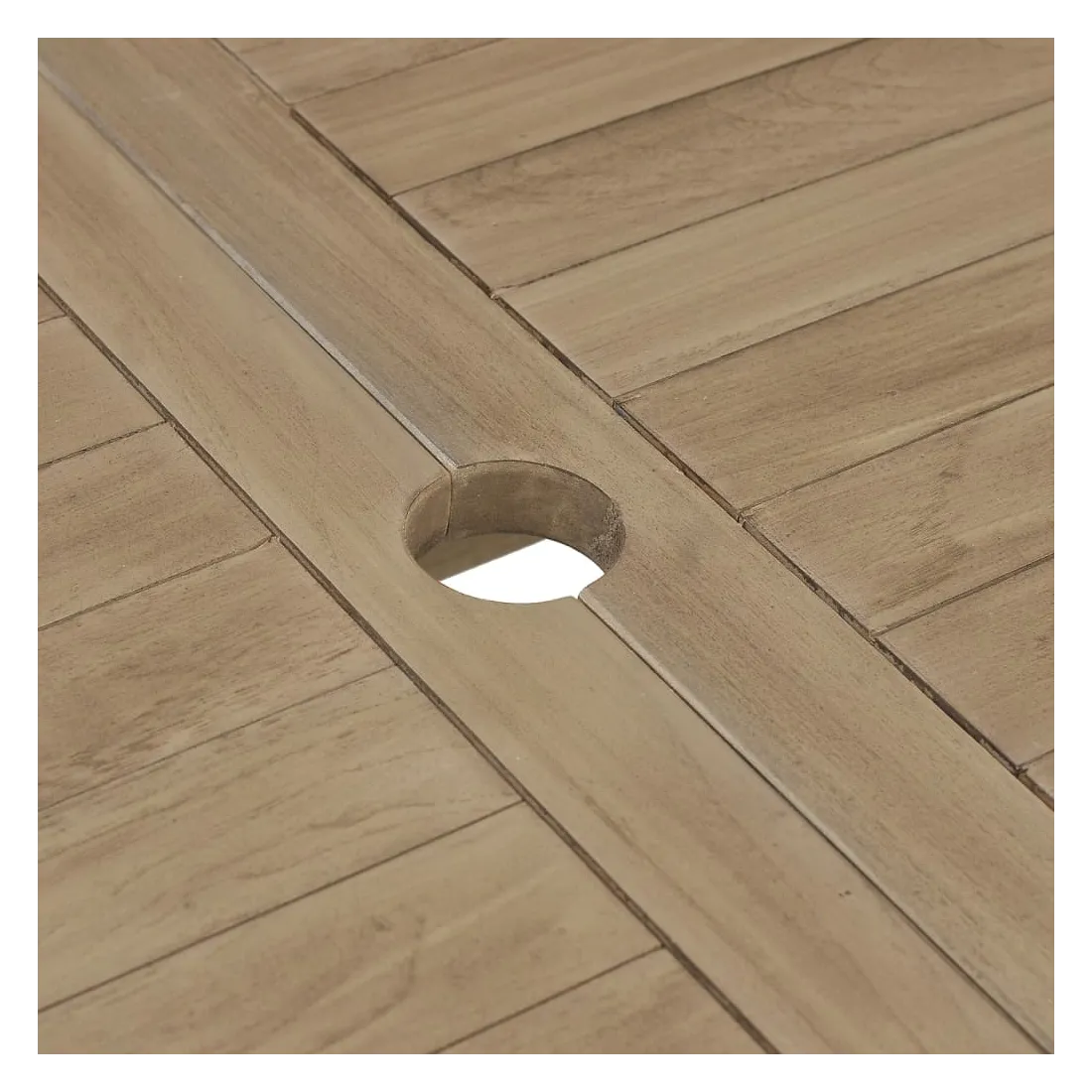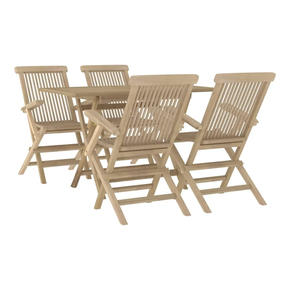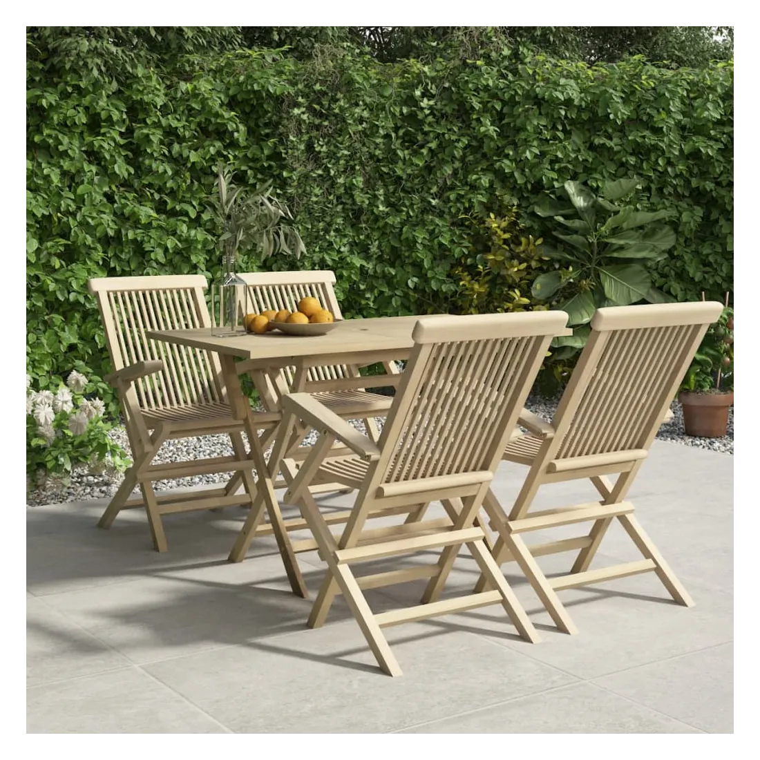 Détendez-vous et profitez d'un thé et de repas agréables avec votre famille et vos amis grâce à cet ensemble de salle à manger de jardin en bois classique ! Bois de teck massif : l'ensemble de salle à manger est fabriqué en bois de teck massif. Le bois de teck massif est un matériau naturel magnifique. Il a été chevronné, séché au four, puis sablé finement pour lui donner une apparence très lisse. Le bois de teck est connu pour sa résistance exceptionnelle et sa résistance aux intempéries.Fonction pliable : l'ensemble de salle à manger d'extérieur peut être plié pour économiser de l'espace lorsqu'il n'est pas utilisé.Expérience confortable : le dossier de la chaise de jardin vous offre un excellent soutien, offrant une expérience confortable optimale.Dessus de table robuste : le dessus de table robuste de la table à manger est parfait pour placer des repas, des boissons, des vases, des bols de fruits ou d'autres objets décoratifs.Trou pour parasol : le dessus de table est doté d'un trou pour parasol, ce qui vous permet de fixer facilement un parasol pour créer un coin ombragé.Design à lattes : la chaise à manger d'extérieur conçue avec un design à lattes est simple et intemporelle. Remarque :Pour que vos meubles d'extérieur restent beaux, nous vous recommandons de les protéger avec une housse imperméable.