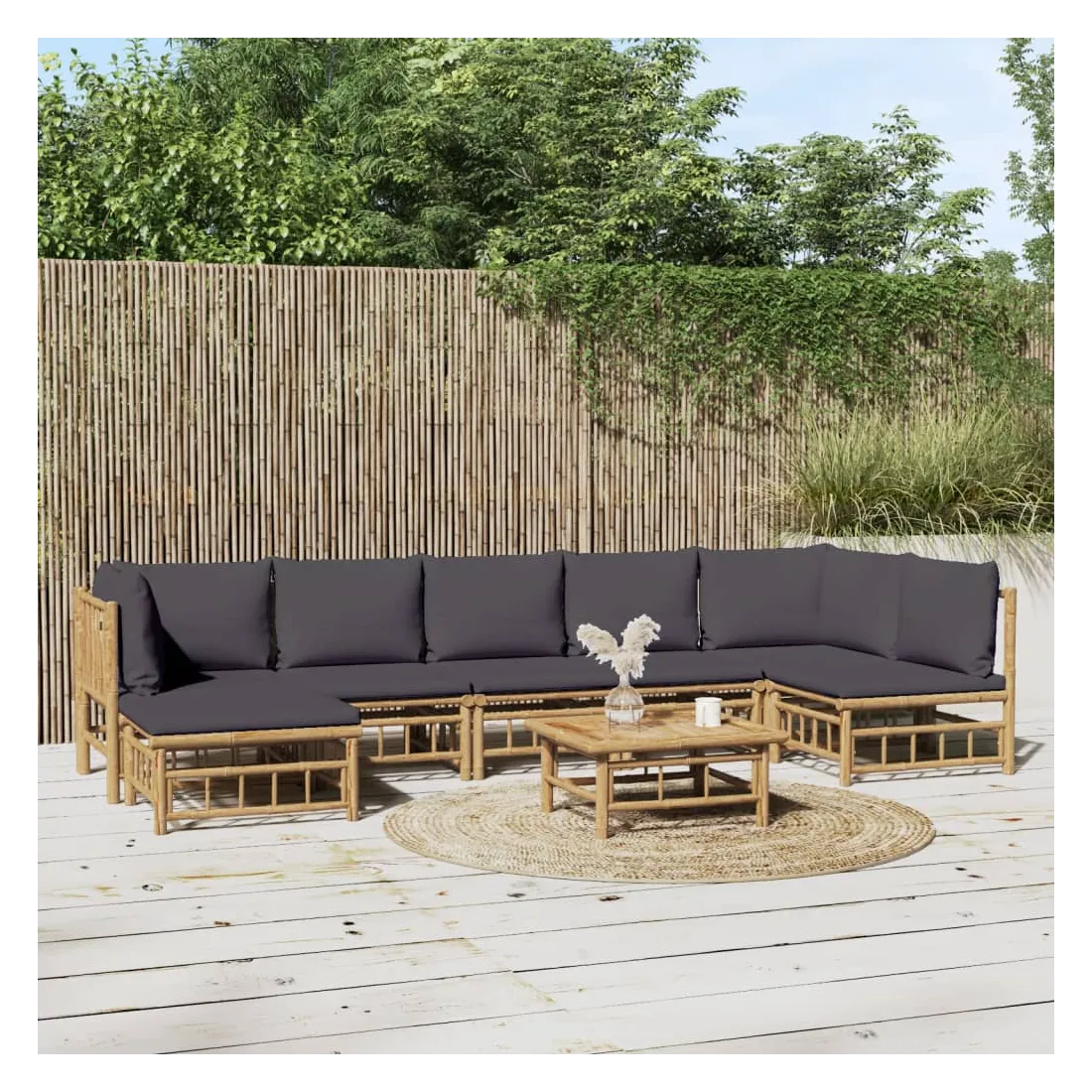 Savourez une tasse de café ou de thé par beau temps dans votre espace extérieur avec cet élégant ensemble de salon de jardin en bambou ! Matériau durable : le bambou est connu pour sa flexibilité et sa dureté. Les meubles en bambou sont une bonne option lorsque vous voulez des meubles d'extérieur solides fabriqués à partir de matériaux naturels.Expérience d'assise confortable : le dossier et l'accoudoir ajoutent un confort d'assise supplémentaire pour l'ensemble de canapé de jardin. De plus, les coussins d'assise et de dossier moelleux offrent un confort pendant votre temps d'assise.Table pratique : la table robuste est parfaite pour placer des repas, des boissons et d'autres objets décoratifs.Conception modulaire : l'ensemble de salon est flexible et facile à déplacer, vous pouvez donc le combiner avec d'autres segments modulaires dans la boutique en ligne pour créer vos propres configurations d'ensemble de salon d'extérieur ! Remarque :Pour que vos meubles d'extérieur restent beaux, nous vous recommandons de les protéger avec une housse imperméable.Bon à savoir :Pour faciliter au maximum le montage, chaque produit est livré avec des instructions.