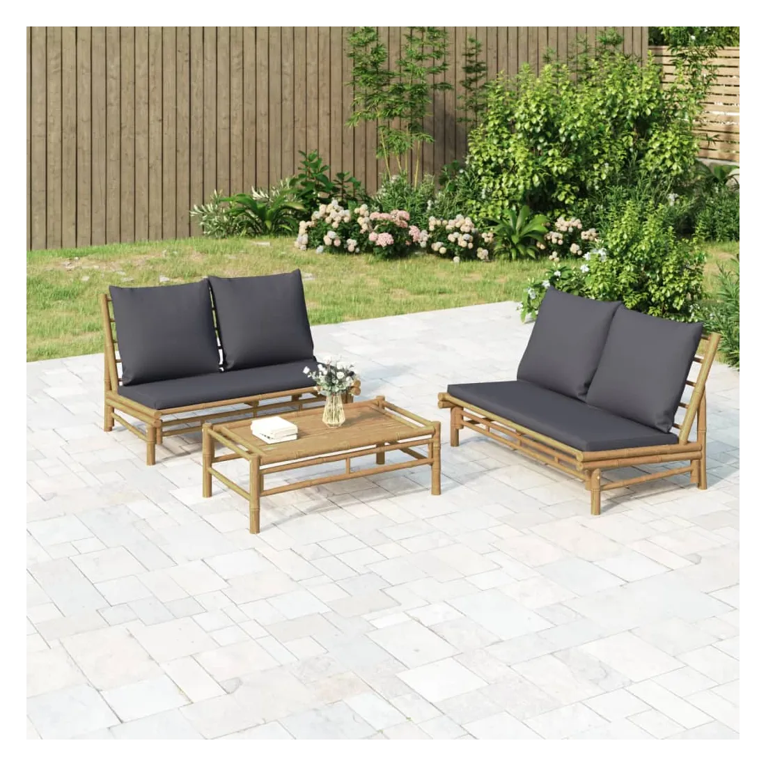 Savourez une tasse de café ou de thé par beau temps dans votre espace extérieur avec cet ensemble de salon de jardin rustique en bambou ! Ensemble en bambou : le bambou est connu pour sa flexibilité et sa dureté. Les meubles en bambou sont une bonne option si l'on veut des meubles d'extérieur robustes fabriqués à partir de matériaux naturels.Expérience d'assise confortable : le dossier ajoute un confort d'assise supplémentaire pour l'ensemble de canapé de jardin. De plus, les coussins d'assise et de dossier moelleux offrent un confort pendant votre temps d'assise.Table pratique : la table robuste est parfaite pour placer des repas, des boissons et d'autres objets décoratifs.Conception modulaire : l'ensemble de salon est flexible et facile à déplacer, vous pouvez donc le combiner avec d'autres segments modulaires dans la boutique en ligne pour créer vos propres configurations d'ensemble de salon d'extérieur ! Remarque :Pour que vos meubles d'extérieur restent beaux, nous vous recommandons de les protéger avec une housse imperméable.